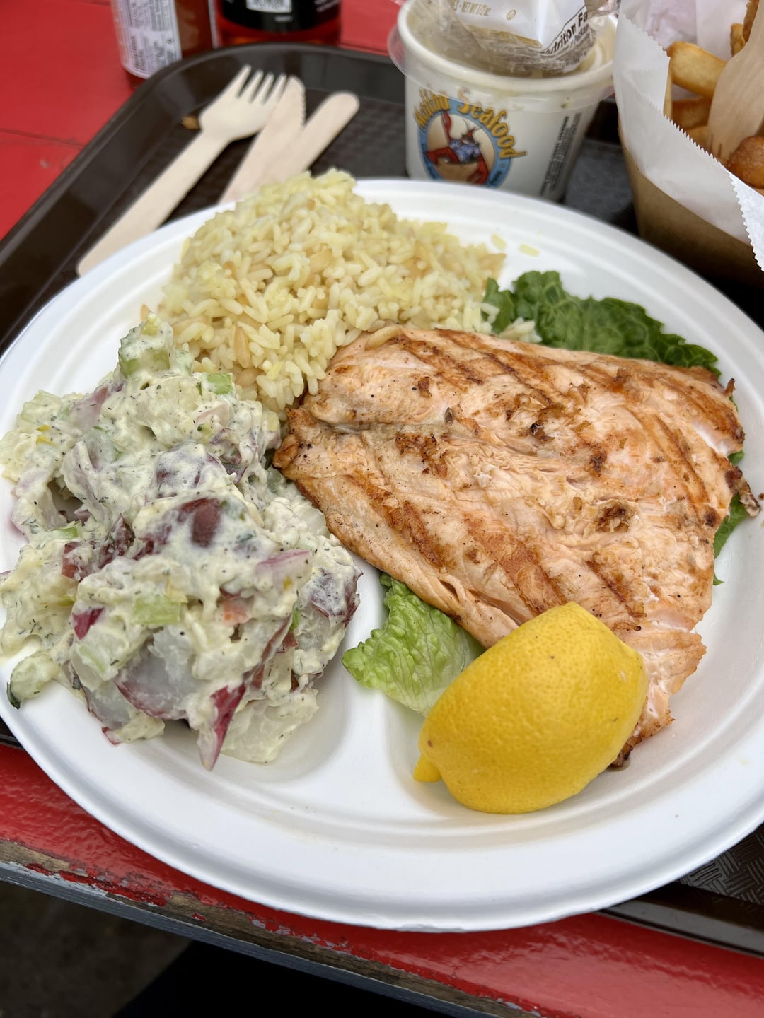 Salmon was okay, not too seasoned. The potato salad was not tradition but super good.