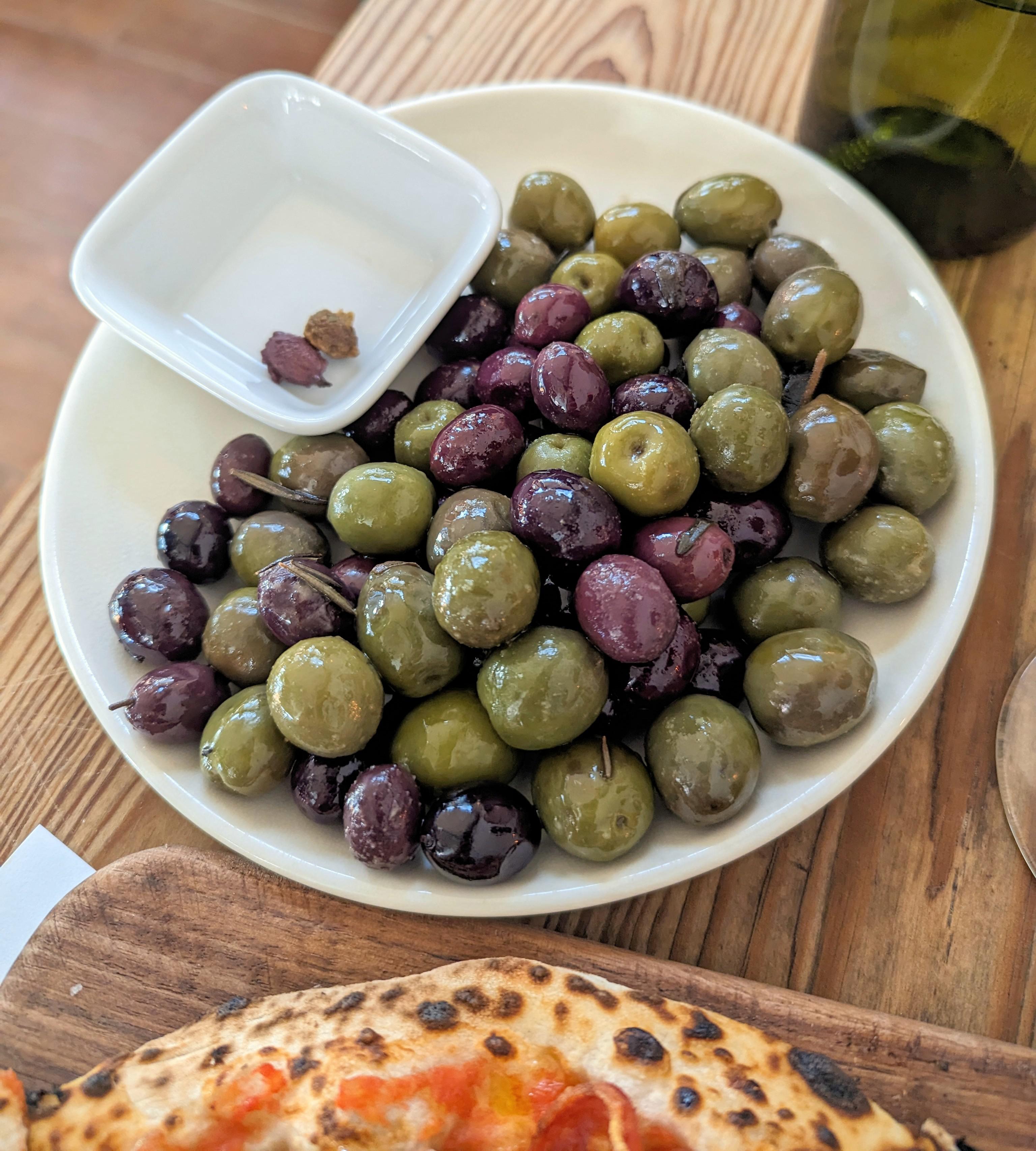 Love this place and have been 5+ times. I think the pizza is great but damn… This plate of olives. Normally $8 but their HH is 1/2 off apps and beer/wine by glass. $60 (sans tip) for a pizza, 4 glasses of wine, and this huge plate of olives.