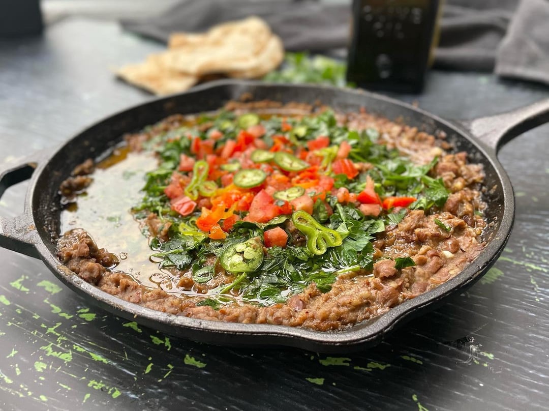 Instructions: 1. Combine lemon juice and hot peppers (if using) in a bowl and set aside. 2. Heat some oil with garlic and onion in your pan. Add your spices and let simmer. 3. I rinsed my beans before adding them so I could have more control over the sodium. Once the beans and water are added mash to desired consistency using a fork or potato masher. 4. Top with chopped parsley and tomatoes, drizzle lemon juice + peppers and more olive oil. 5. Eat warm with pita.