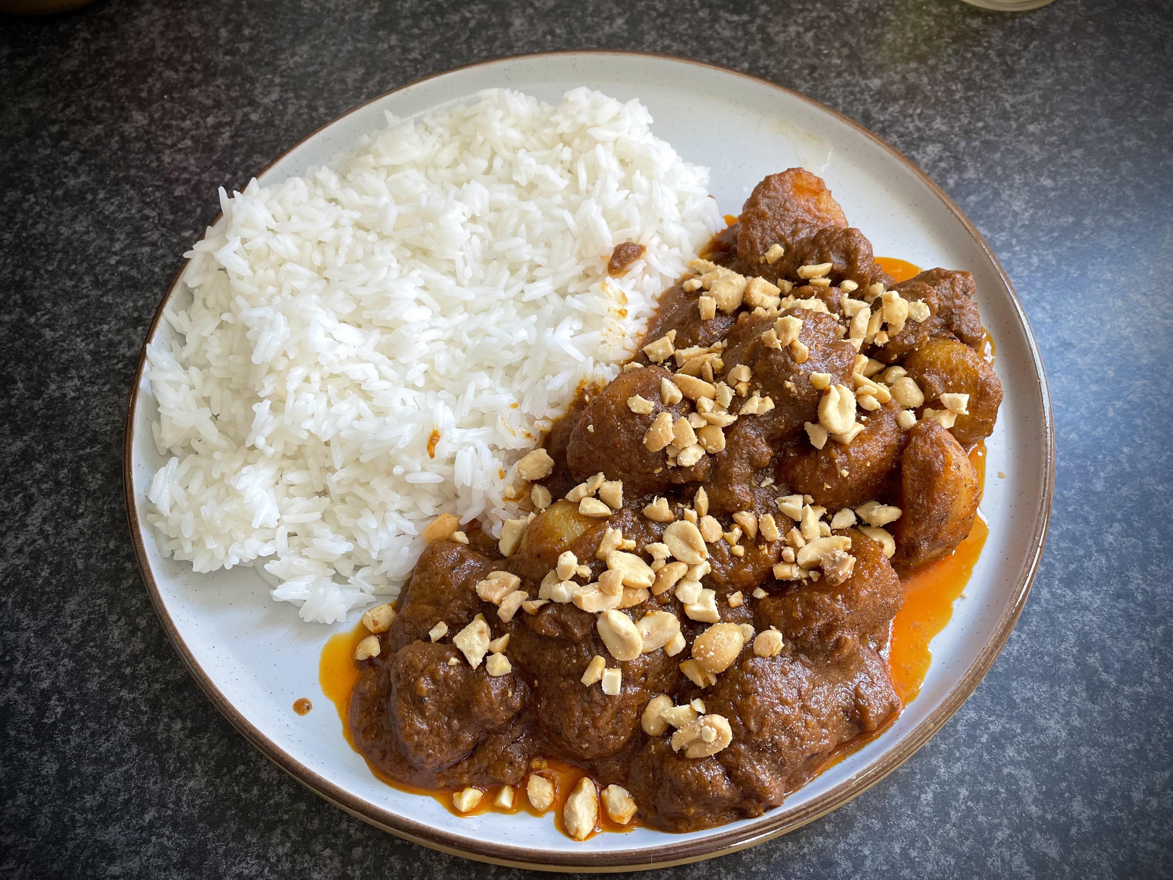 Fried off some shop bought massaman paste from the Asian supermarket, added diced lamb and browned, added a can of coconut milk and some lamb stock. Cooked covered for over a hour, added halved small potatoes, cooked for a further 30 mins, seasoned with Thai fish sauce and palm sugar, topped with crushed peanuts.