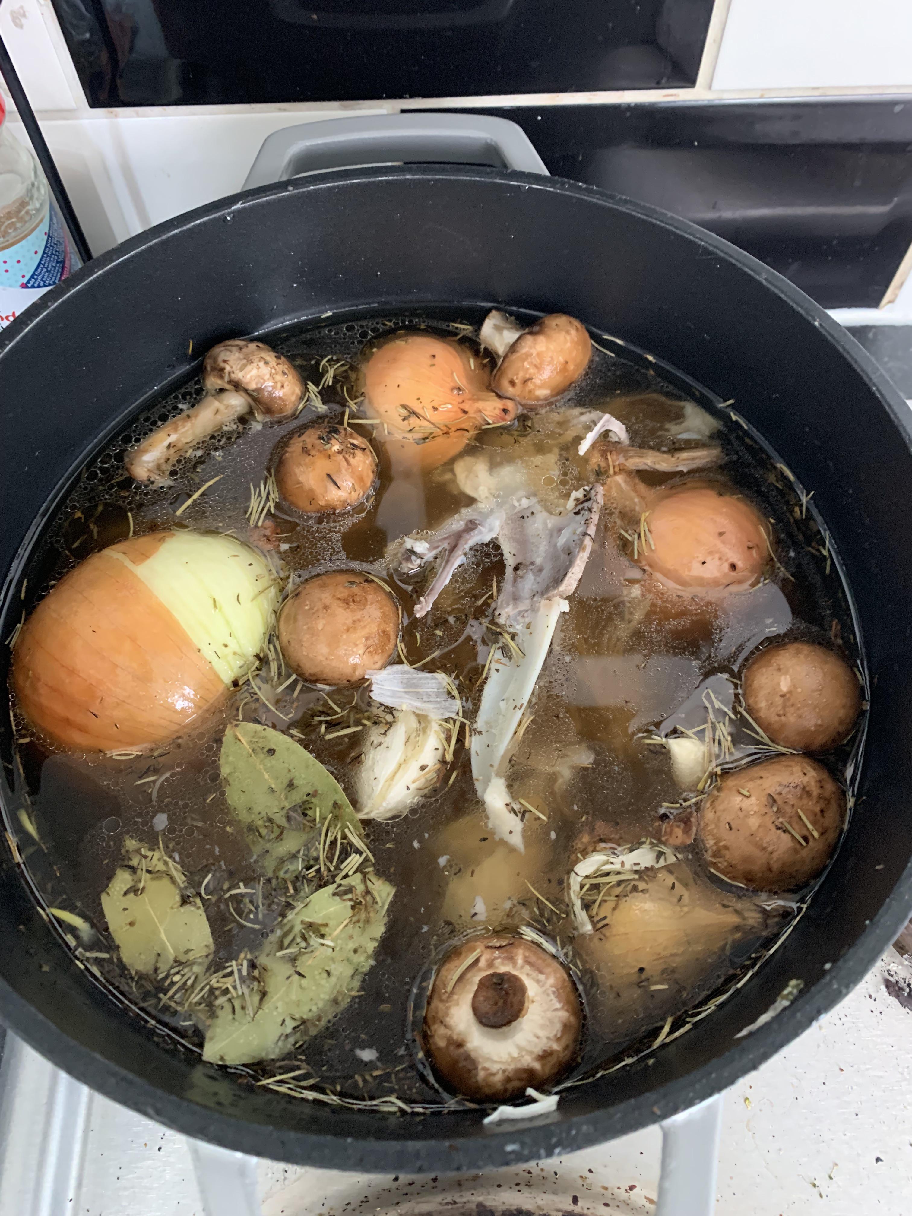 Chicken carcass and wings (all meat pulled off), resting juices, onion, mushrooms, garlic, bay leafs, thyme, rosemary, salt and pepper, water. I’d usually use fresh herbs but I was out so dry will have to do.