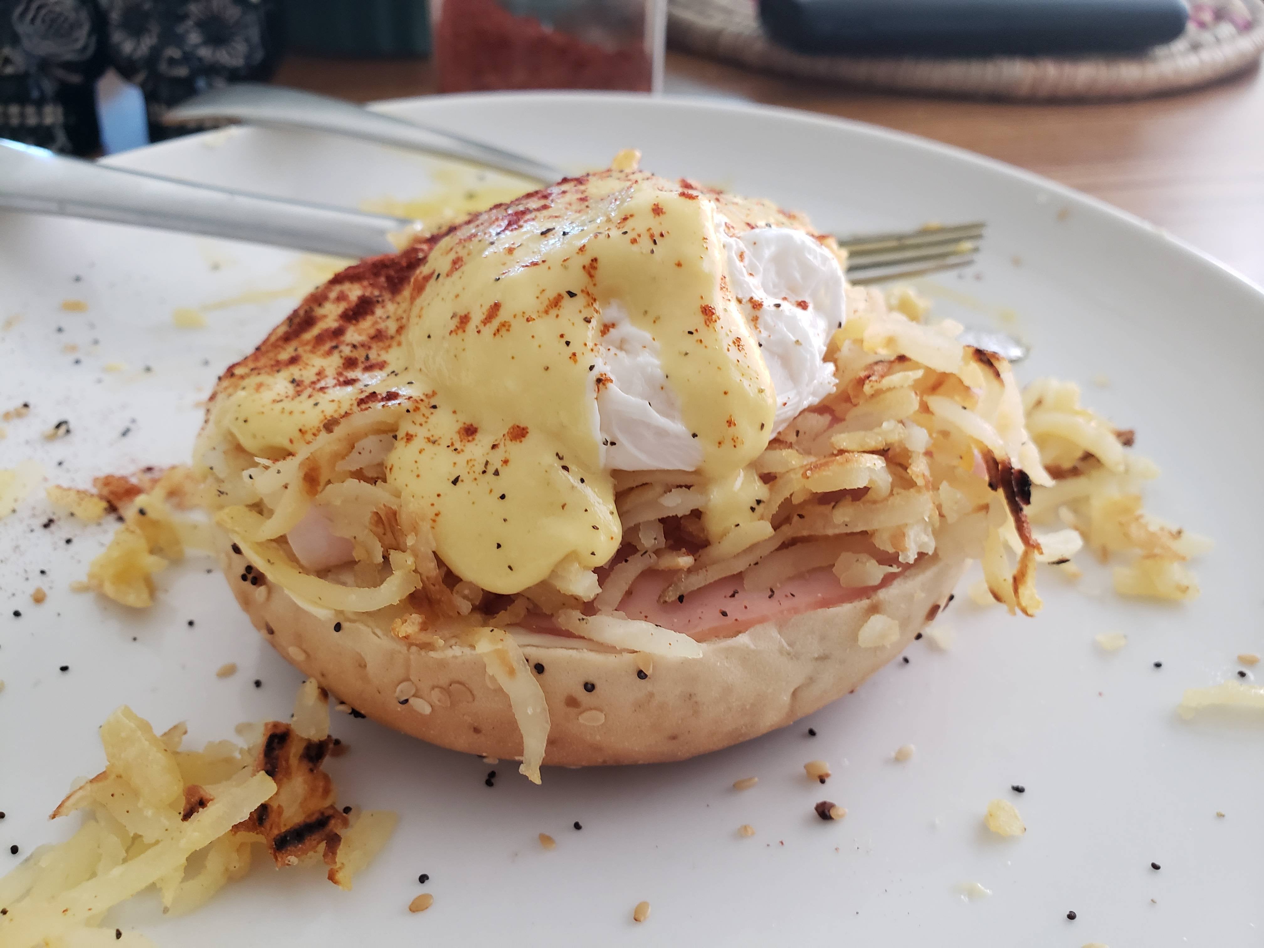 [Homemade] Eggs Benedict on an everything bagel with ham, oven roasted turkey, and hash browns.by Mad_Juju Write A CommentYou must be logged in to post a comment.