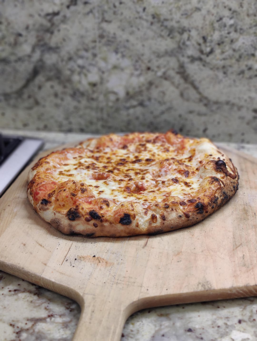 65% hydration, 24 hour polish, 24 hour cold ferment. 700 F floor, 950 F dome.