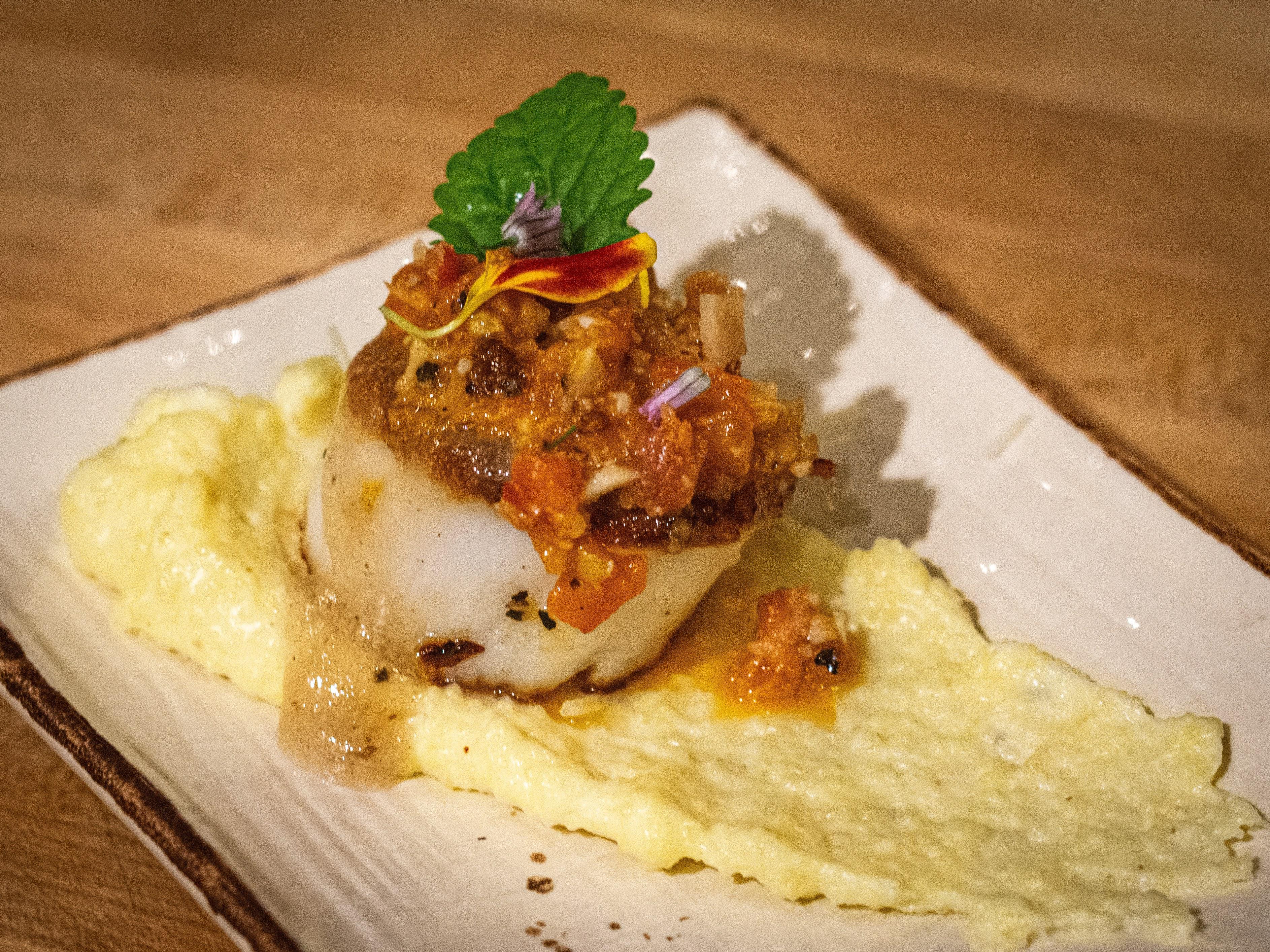 Seared scallop, polenta, pork belly salsa, lemon balm, chive blossom, thickened fish stockby coleherning Write A CommentYou must be logged in to post a comment.