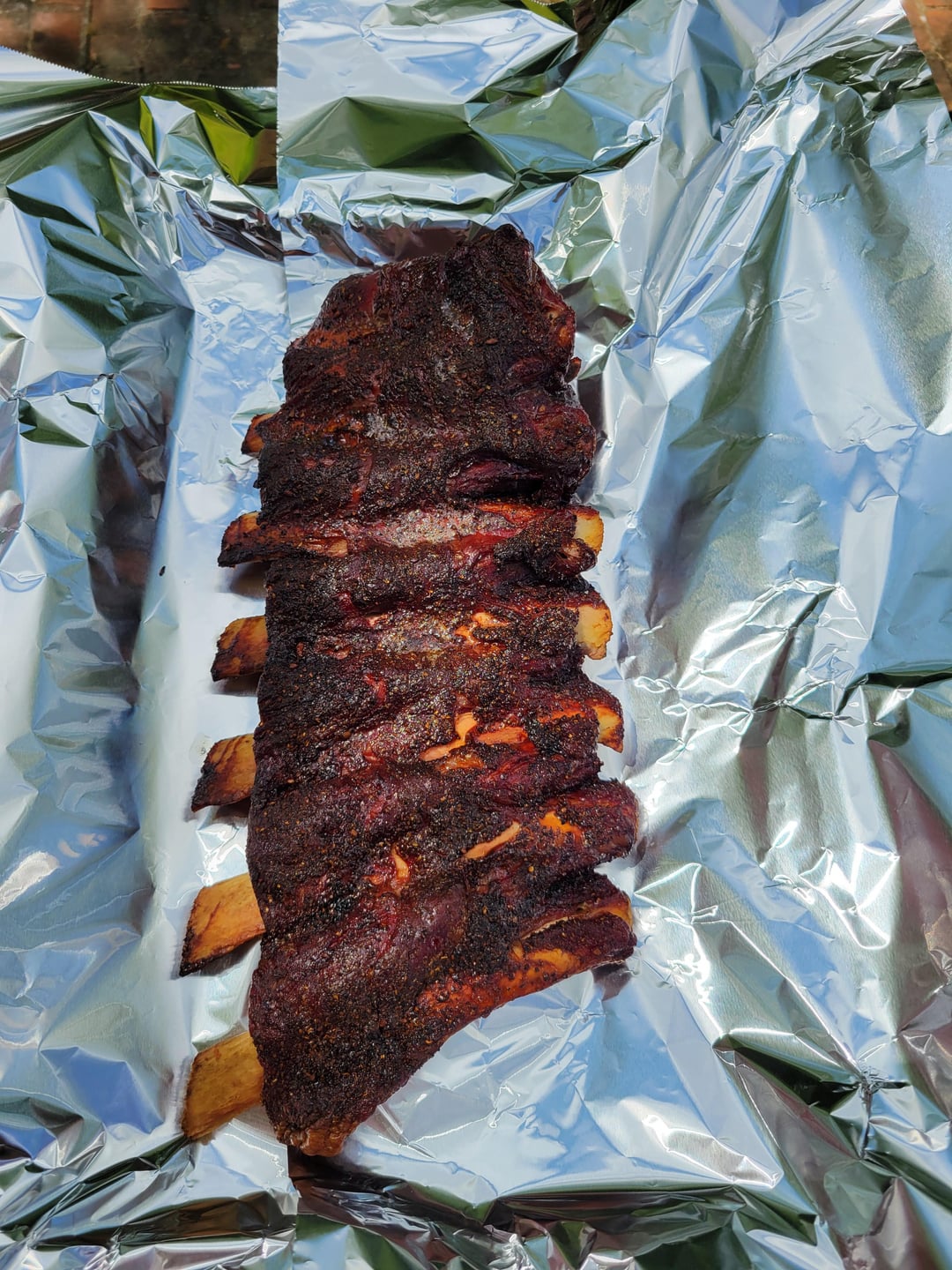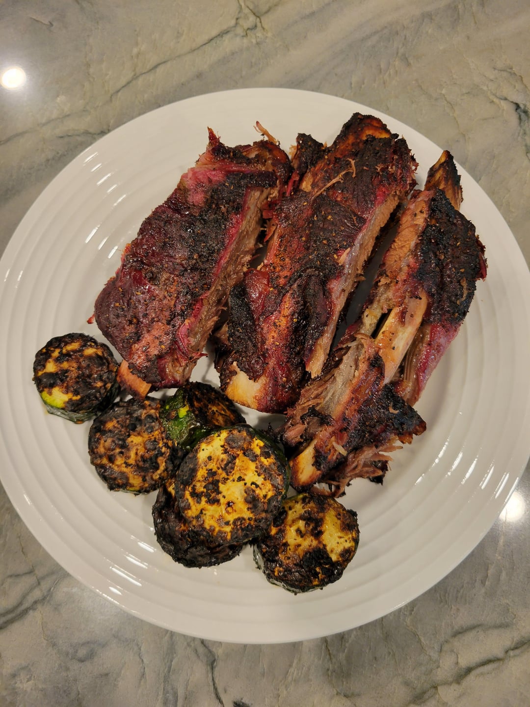 ~4 hours at 250, pulled at 203 interior temp, rested in foil for almost an hour as I kicked up the heat for the zucchini and had couple beers