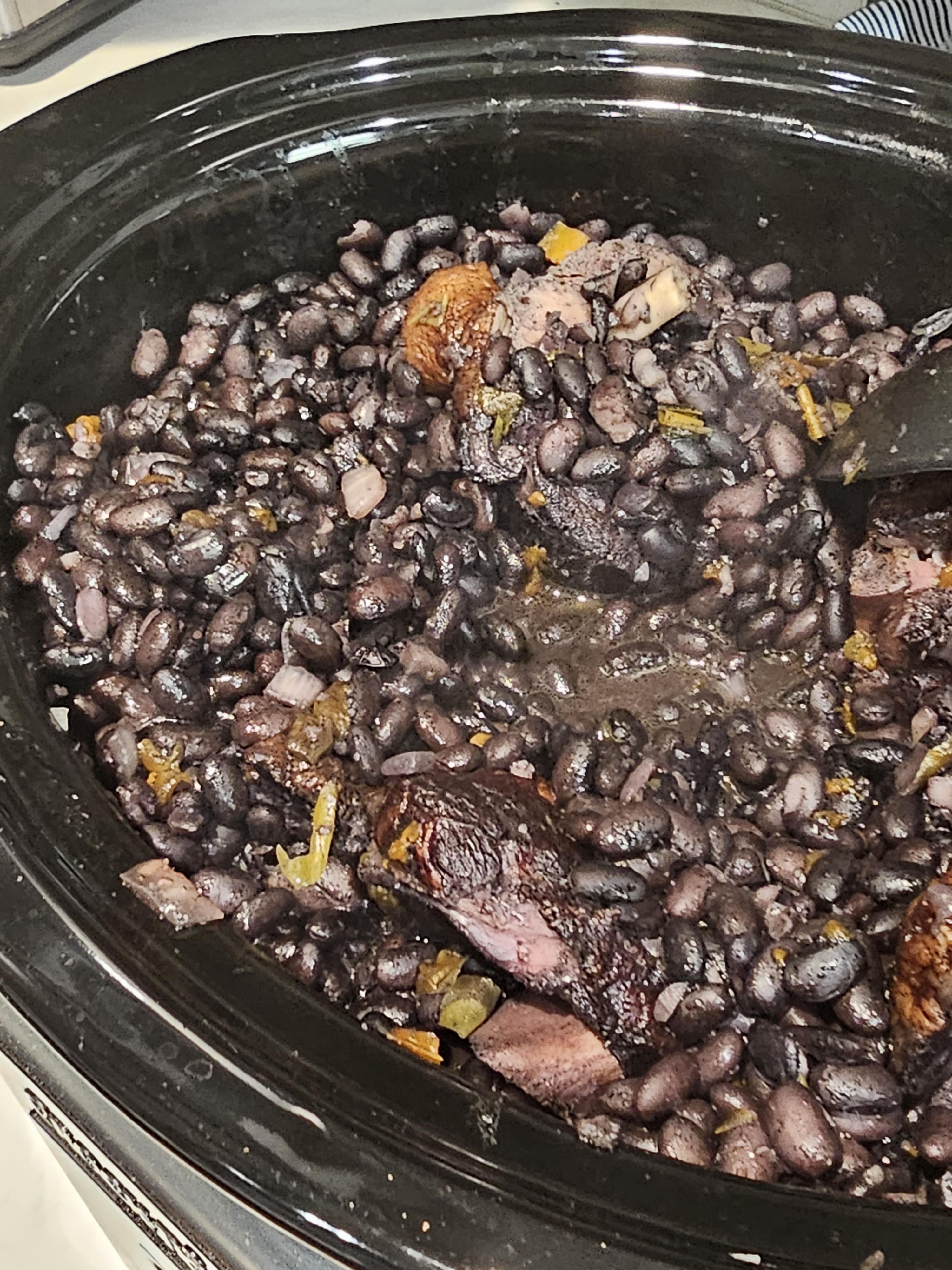 Recipe says 8 hours on low. I am am 4 hours. The black beans went in dry (not soaked) per the recipe.