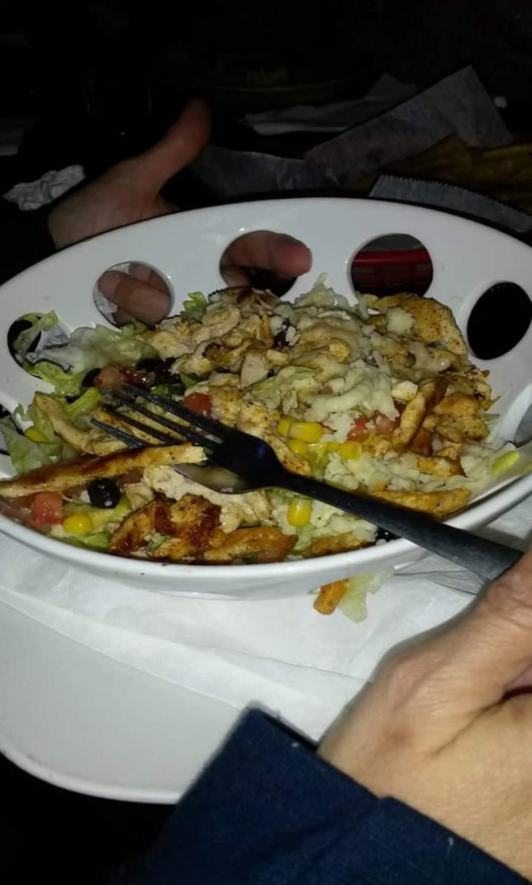 Scadre02 3 years ago A chipped bowl with holes in it filled with salad on top of a regular plate… wtf?