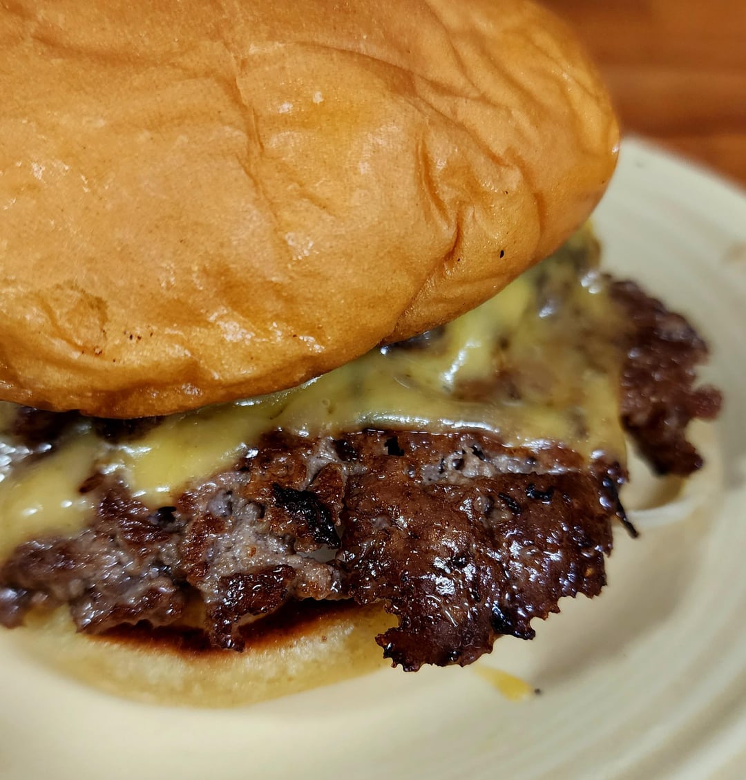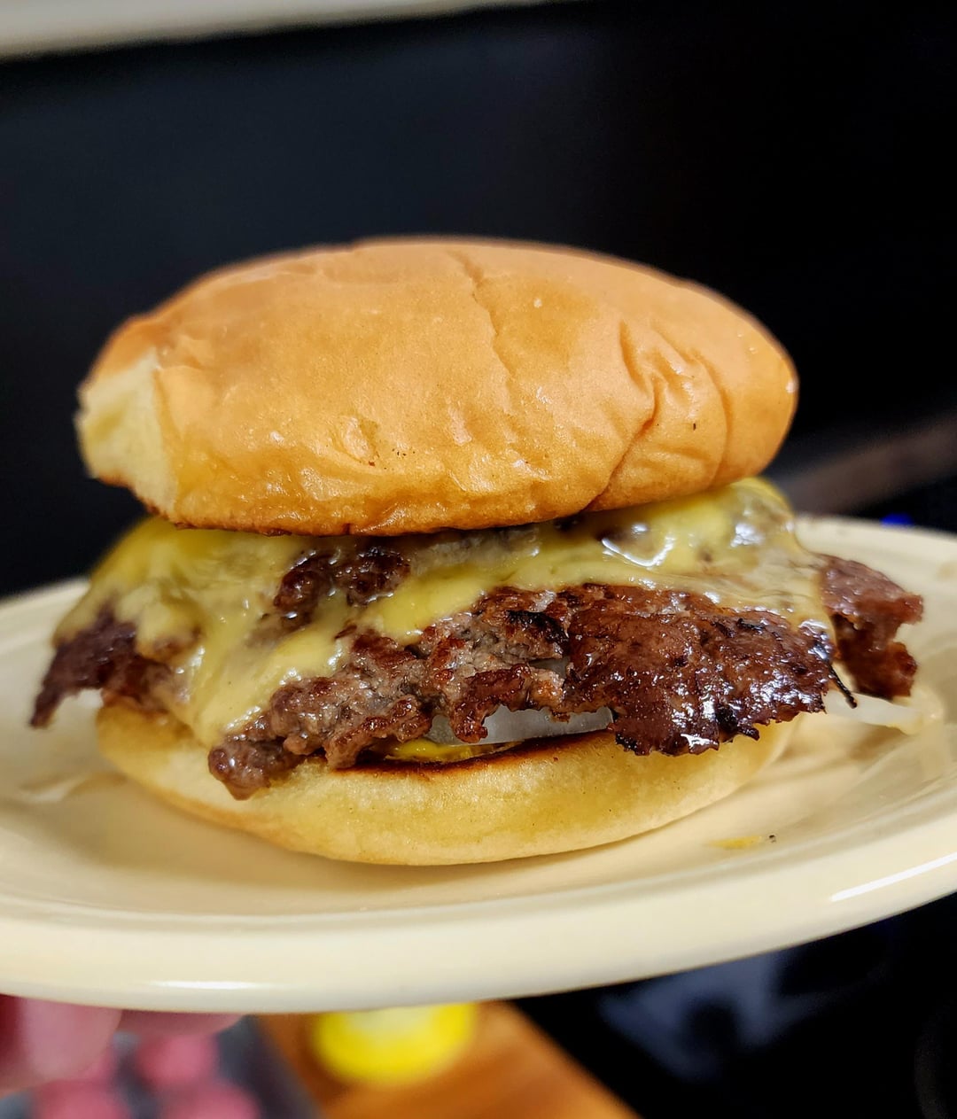 Two 2.25oz 75/25 balls of ground chuck smashed in a 500°F cast iron pan, seasoned with kosher salt. Scraped and flipped, then topped with Boar’s Head yellow American deli sliced cheese and covered to melt. Once melted, the patties were stacked and placed on a buttered and toasted Martin’s potato roll with French’s yellow mustard and raw white onion. Simple. Delicious.