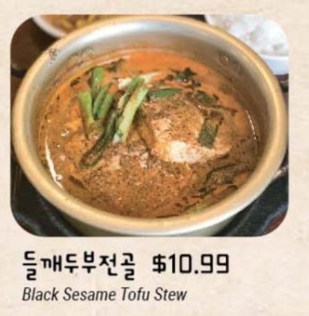 I think it’s some form of Deulkkae Soondubu Jjigae (Soft Tofu Stew with Perilla Seeds). Perilla seeds are similar to sesame seeds but darker, hence “black sesame.”