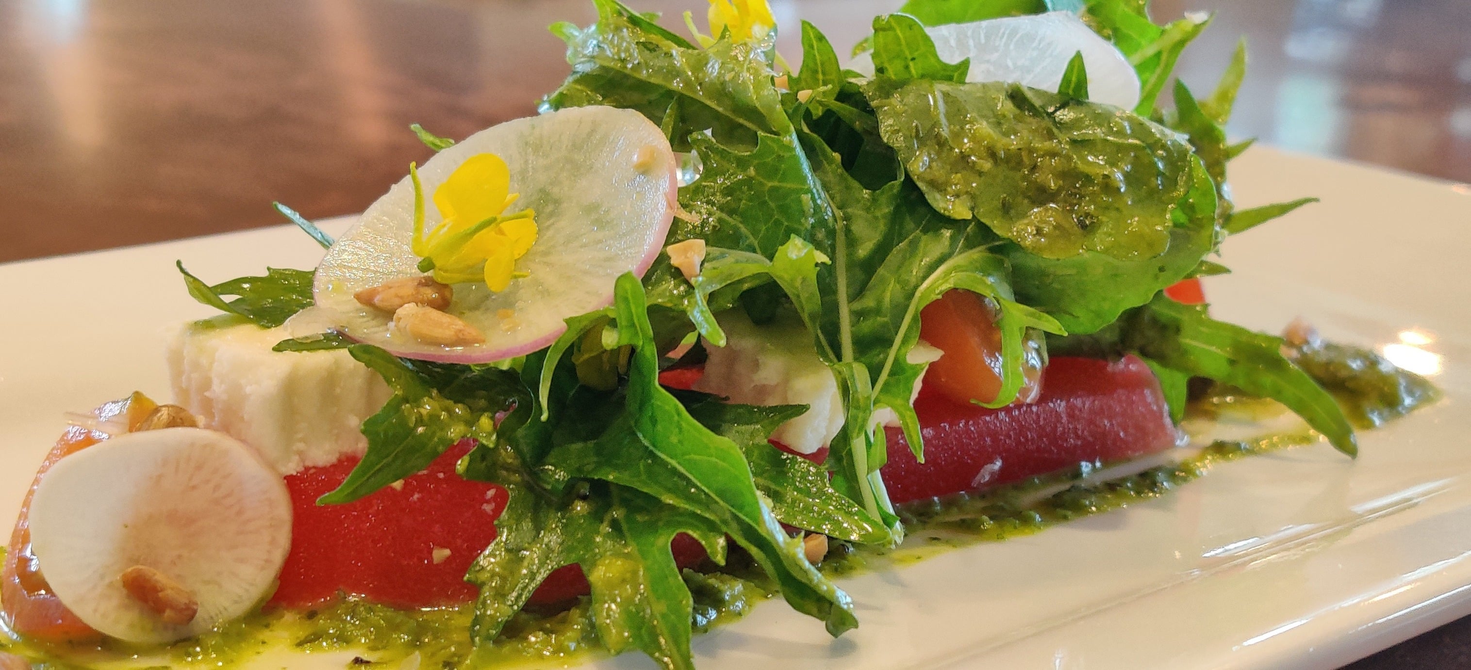 Compressed watermelon, Easter egg radish, feta, cherry tomatoes, garden arugula, burnt rosemary vin, marcona almonds. Very simple, but tasty.by Unfair_Holiday_3549 Write A CommentYou must be logged in to post a comment.