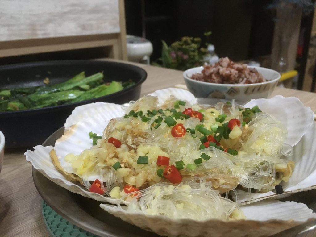 1. Rehydrate glass noodles in fresh water for a couple of hours, or with hot water for an hour 2. Finely slice scallion greens and a chilli pepper and reserve for garnish. Bring a pan of water to boil, for steaming the scallops later. 3. Peel and finely mince garlic cloves. Using a second pan, gently sweat minced garlic in butter until fragrant. Make sure it looks like you have more garlic and butter than you need. 4. Give the rehydrated glass noodles a few snips with kitchen shears, and mix into the garlic and butter. Season with soy sauce, stir to combine. 5. Arrange scallops on a heat-resistant plate. Top scallops with glass noodle and garlic butter mixture. 6. Steam scallops in the pain over vigorously boiling water for a few minutes. In the meantime, stir fry vegetables in residual butter and garlic in the second pan. 7. Garnish with scallion greens and chilli pepper. Serve immediately, with rice.
