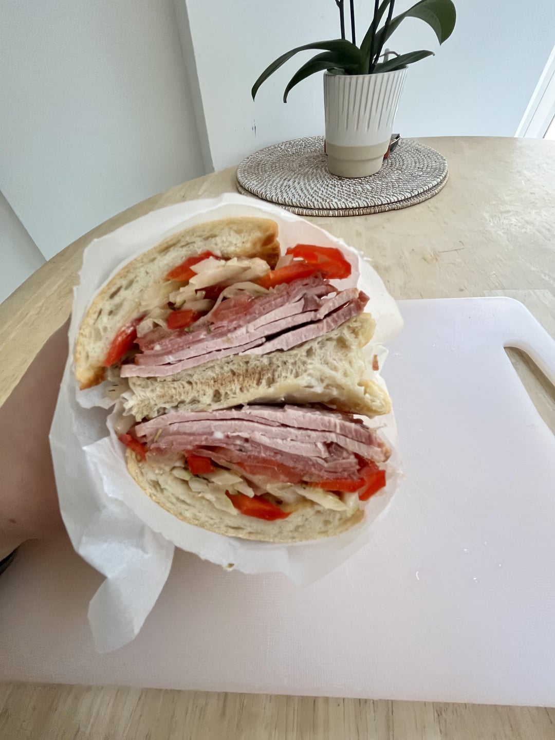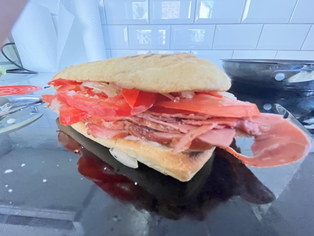 1. Smoked ham and pastrami sandwich, with garlic mayo. Onions, sweet peppers and yes salted tomatoes with olive oil, salt and some dried herbs in there