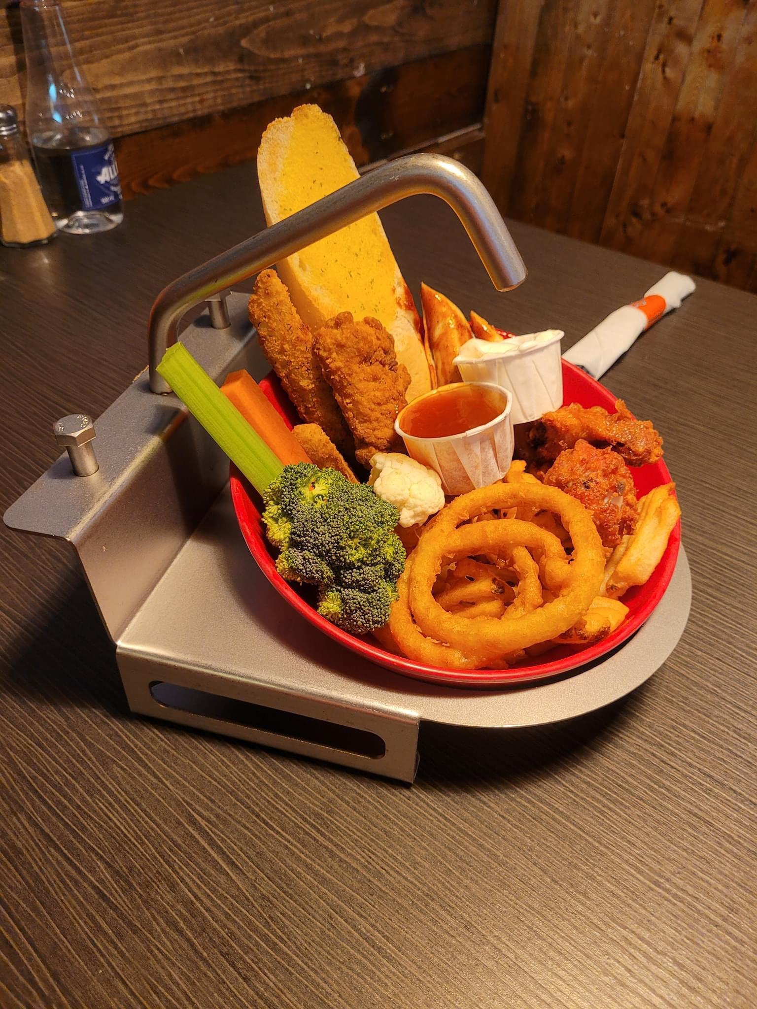 2 nuggets, 2 wings, 3 onion rings, one broccoli and a piece of garlic bread.