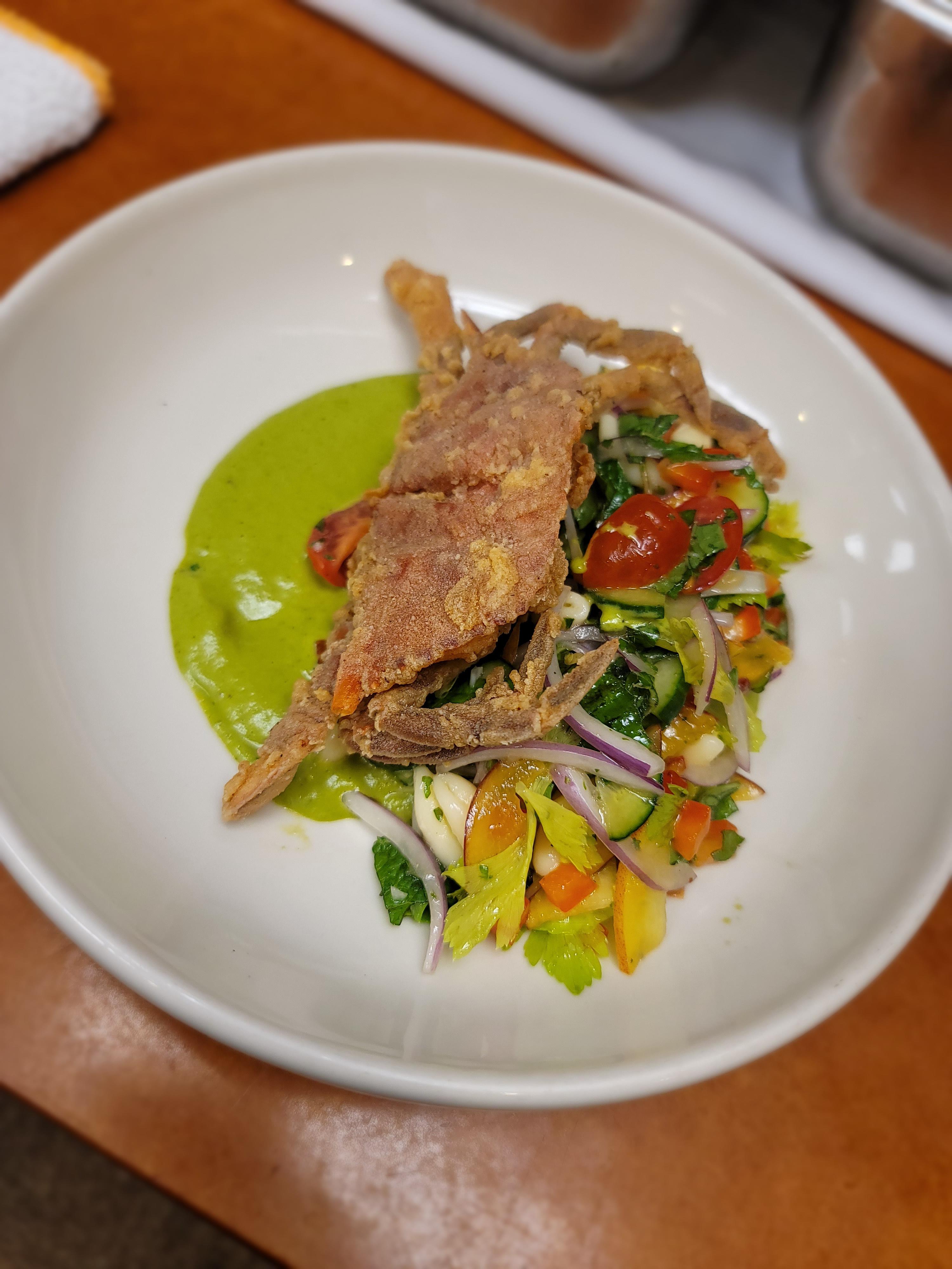 Soft Shell Crab, summer salad (peaches, cucumber, onion, pepper, herbs, cavatelli, jalapeno ginger vin) smoked poblano sauce.by Prudent-Tennis4339 Write A CommentYou must be logged in to post a comment.