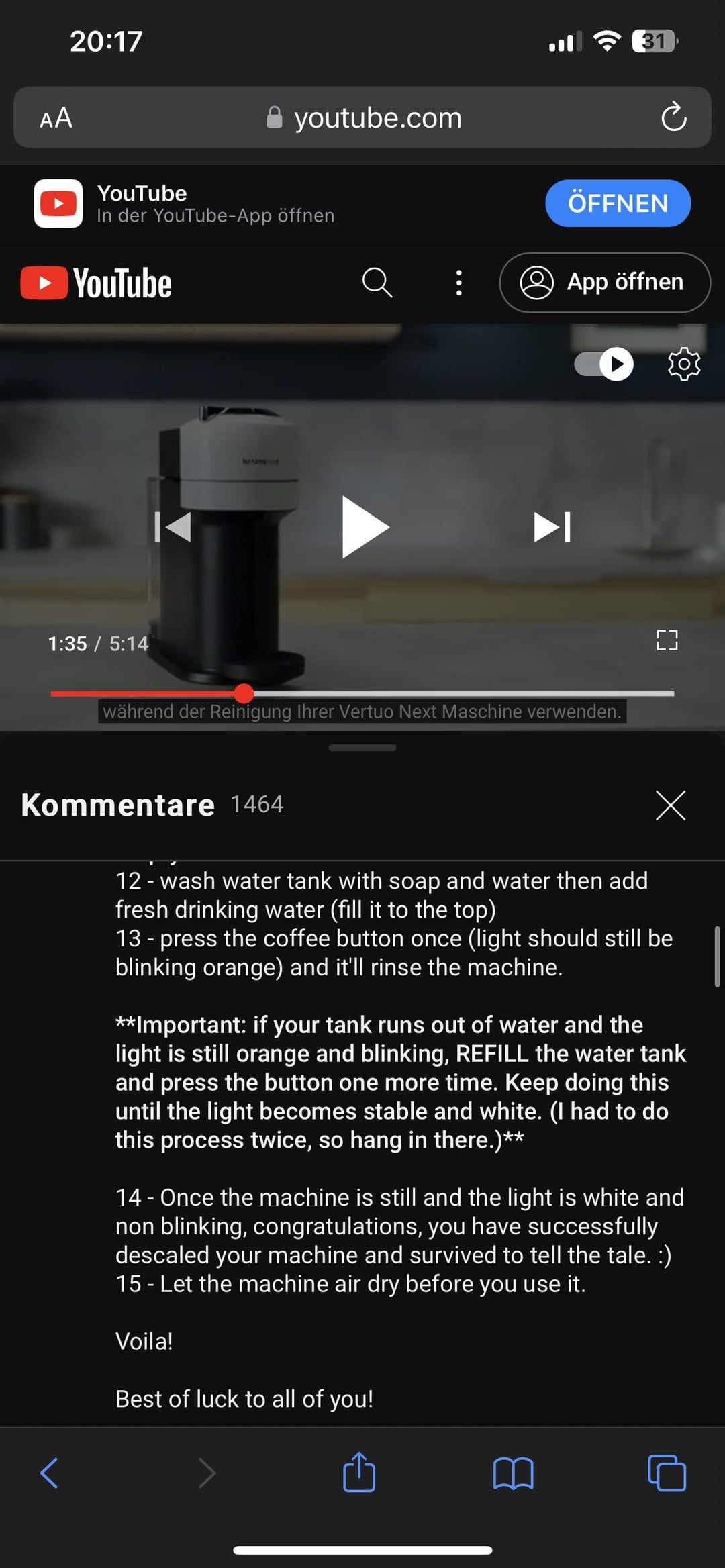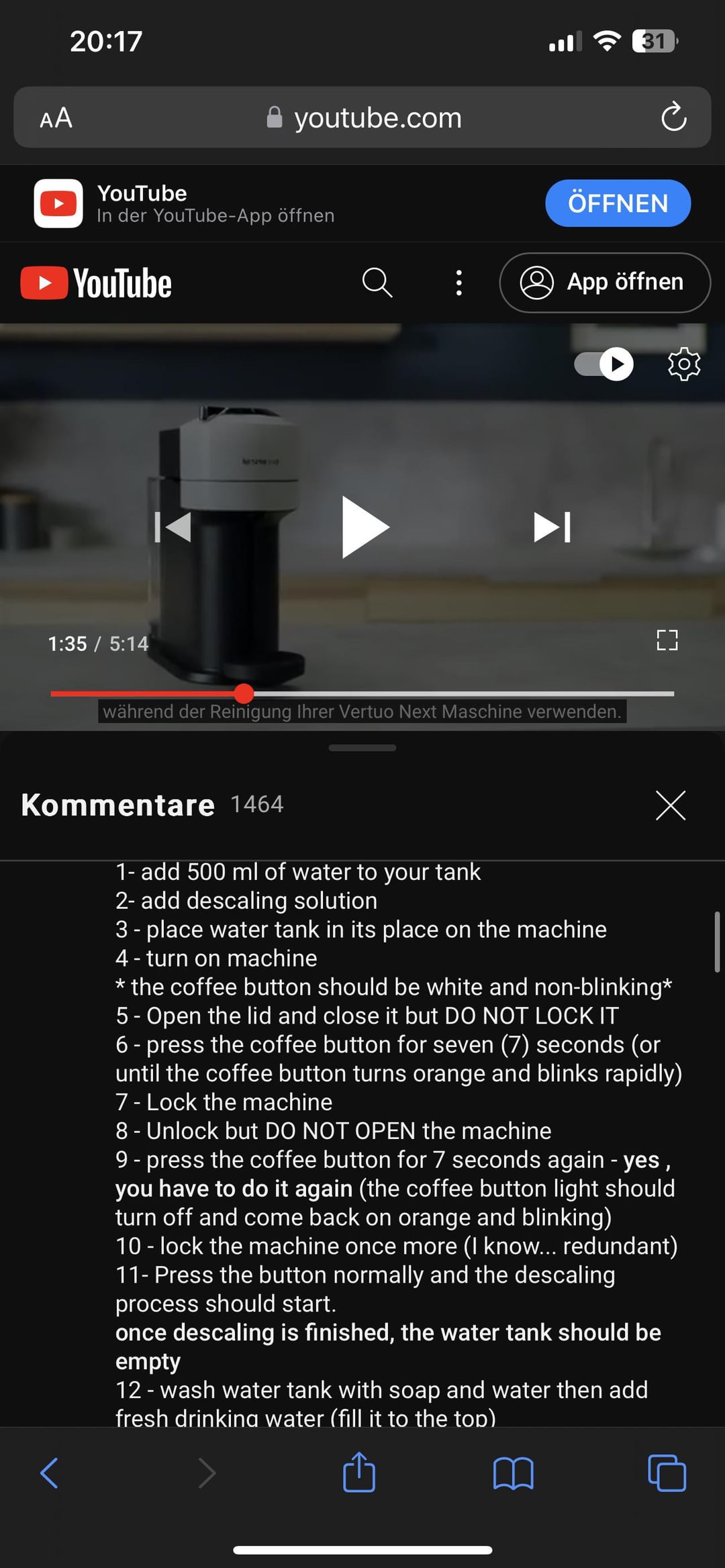 Haha I had to resort to the same YouTube comment because the video is so useless. Just make a descaling button, Nespresso.