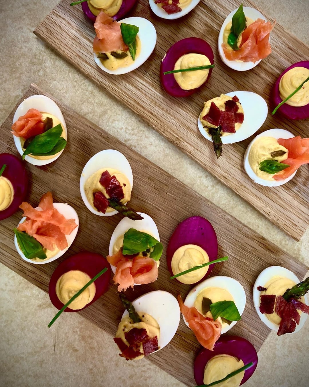 Deviled eggs 3 ways🥚 Smoked salmon, Macon with asparagus and pickled beets.by Zaibzhoosen 1 Comment 1forcats 2 years ago Macon being the fancy version of pork belly strips, cured and fried crispyWrite A CommentYou must be logged in to post a comment.