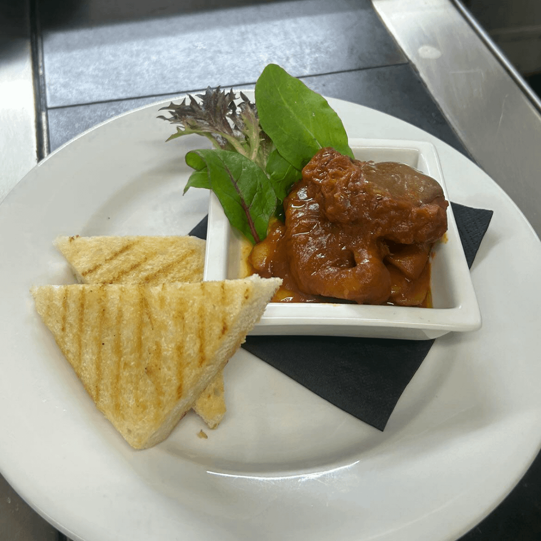 It looks tasty, but the presentation is a bit dated in my opinion. I think it’s mostly the large plate with the square dish on top of it. The crustless sandwich type bread also adds to that, I’d much prefer a bit of baguette or some focaccia.