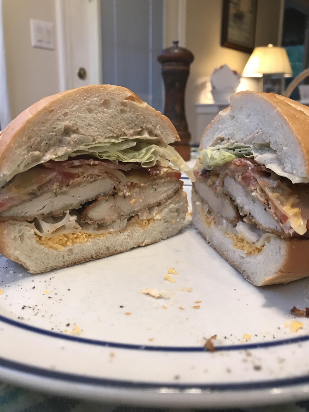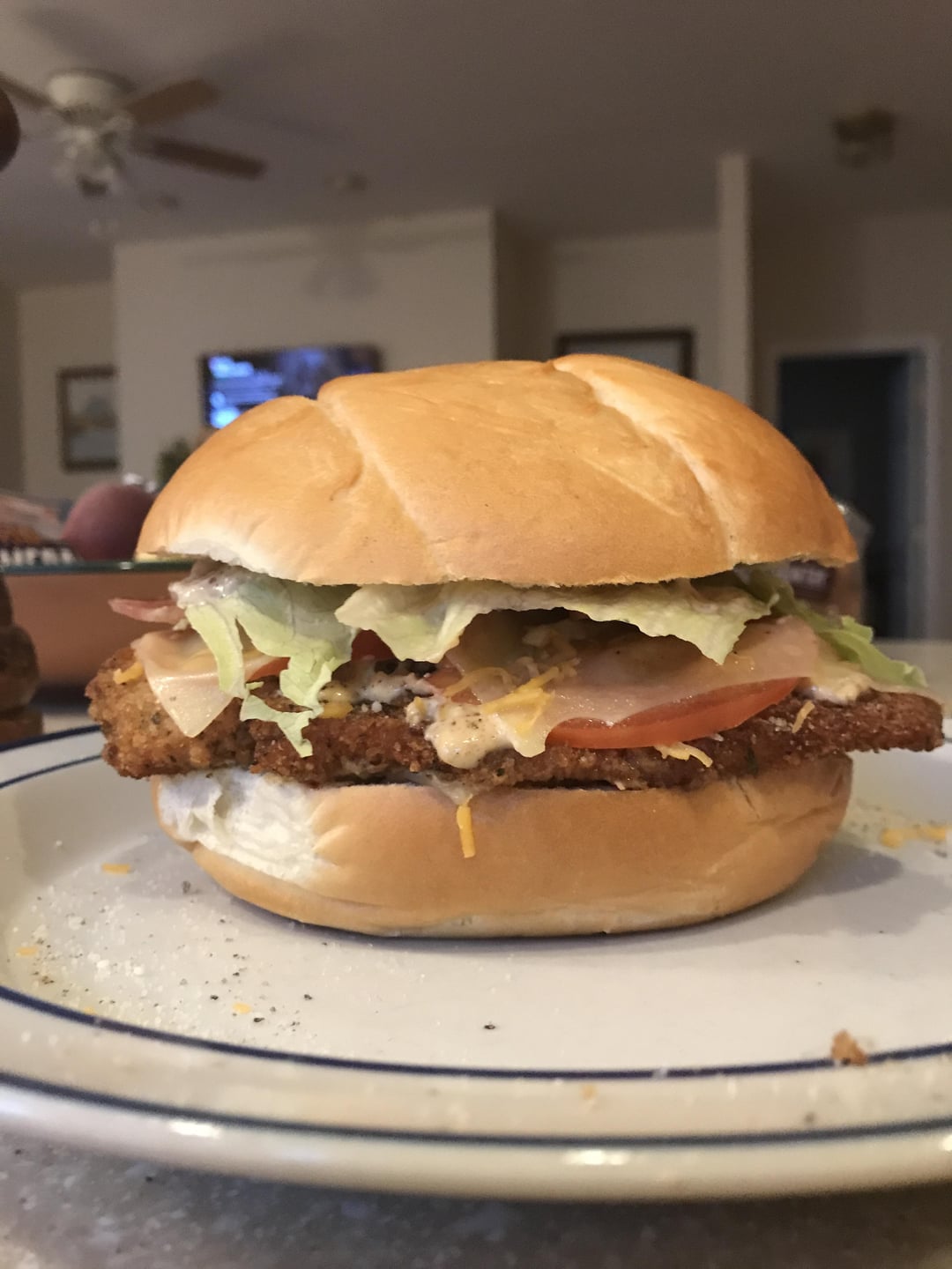 On the roll I laid down a base of shredded cheddar and slice of Swiss before adding dressing and diced white onions. Two pieces of homemade breaded chicken cutlets leftover from last night. Salt and dressing, then tomato and more s&p, Swiss cheese and a little cheddar.