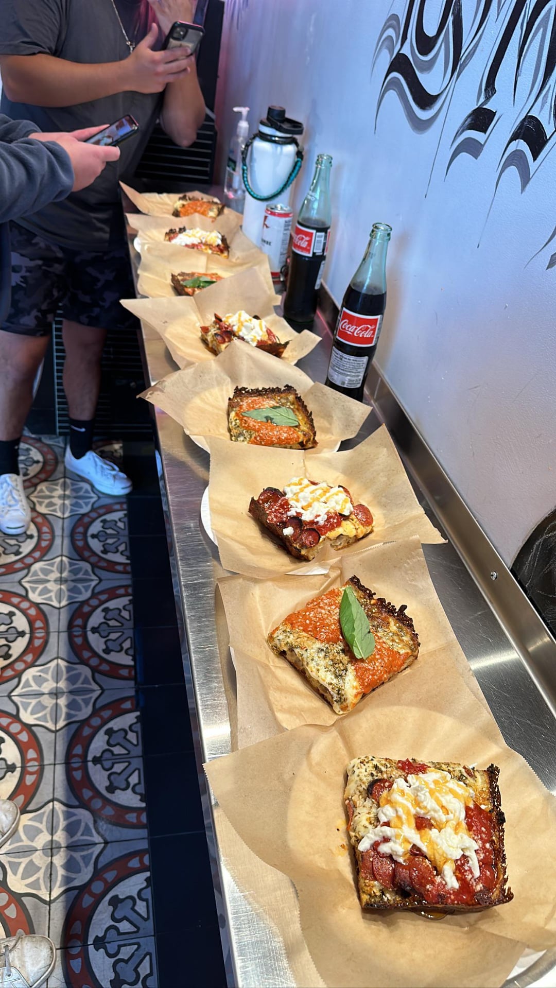 Opens at 12, cash only. Add the burrata and hot honey, absolutely worth it. Vodka & Pepperoni slices both 10/10