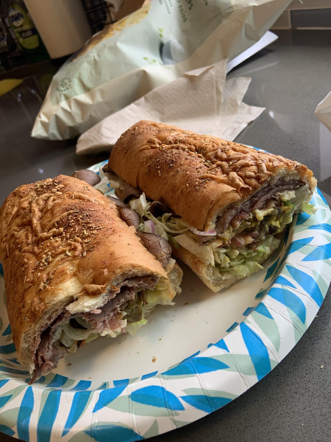 Roast beef & bacon, pepper jack, extra lettuce, tomatoes, red onions, black olives, extra jalapeños, yellow mustard, chipotle sauce and black pepper. 9/10 was pretty bangin ngl.