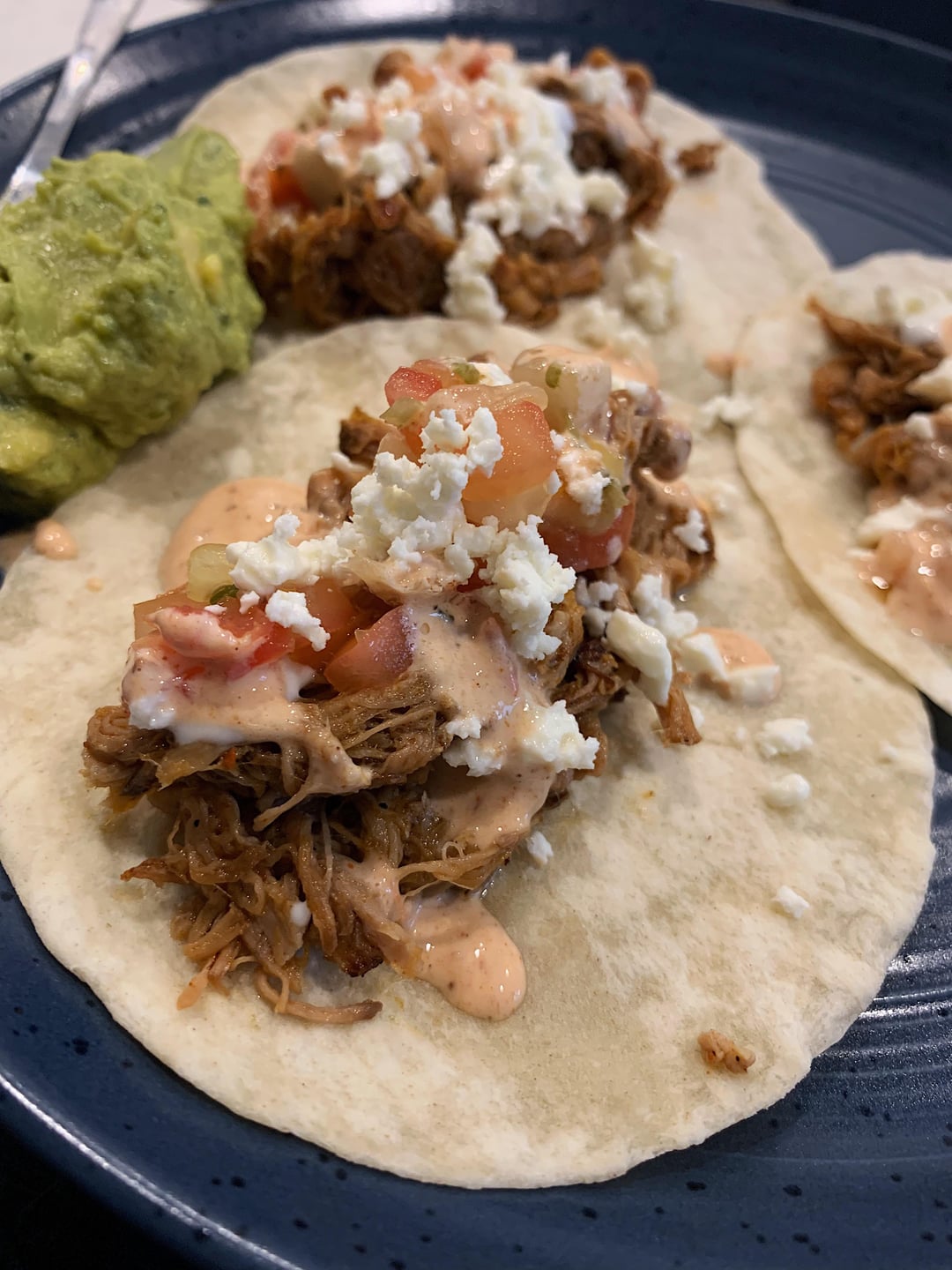 I made carnitas in the slow cooker! (Crisped up in cast iron) 🌮 Served with guac, pico, and chipotle crema