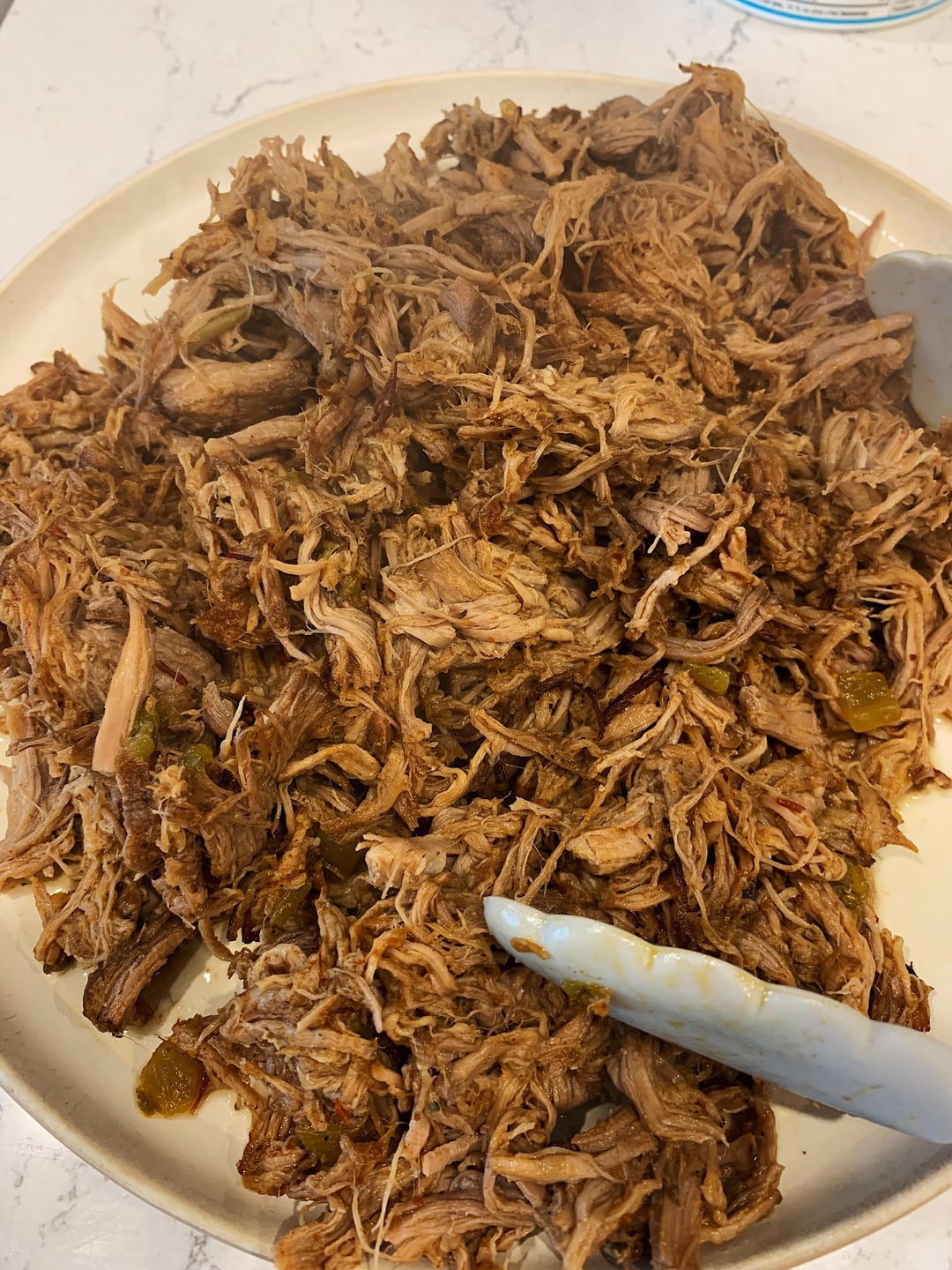 Pork shoulder that I rubbed with salt, pepper, cumin, garlic powder, onion powder, oregano, and chilli powder. To the pot I added 2 cups of low sodium chicken stock, 2 bay leaves, 1 cup of pure orange juice, 1/8 cup lime juice, and 5 cloves minced garlic. I went a bit rogue and added 1 can of chipotle adobo SAUCE and 1 can of green chiles because I love them.