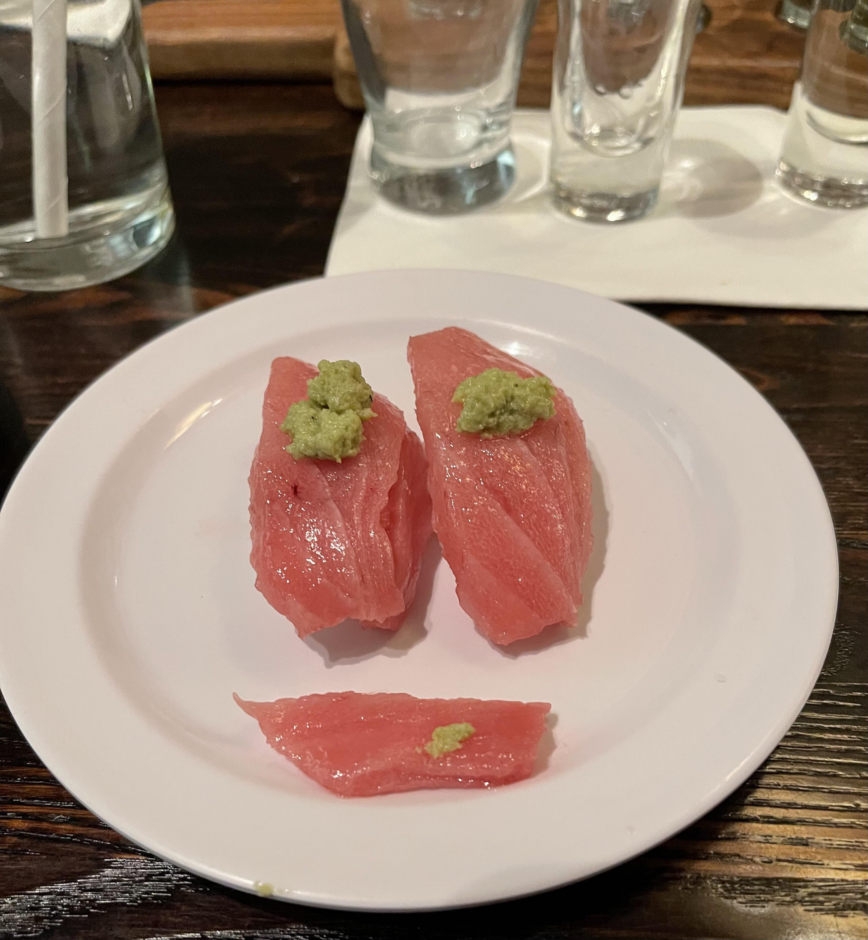 Toro sushi prepared by Chef Minaeo at Sushi Sazanami featuring his homemade wasabi. No chewing is required, just let it melt in your mouth and savor the wasabi and fatty tuna oil!