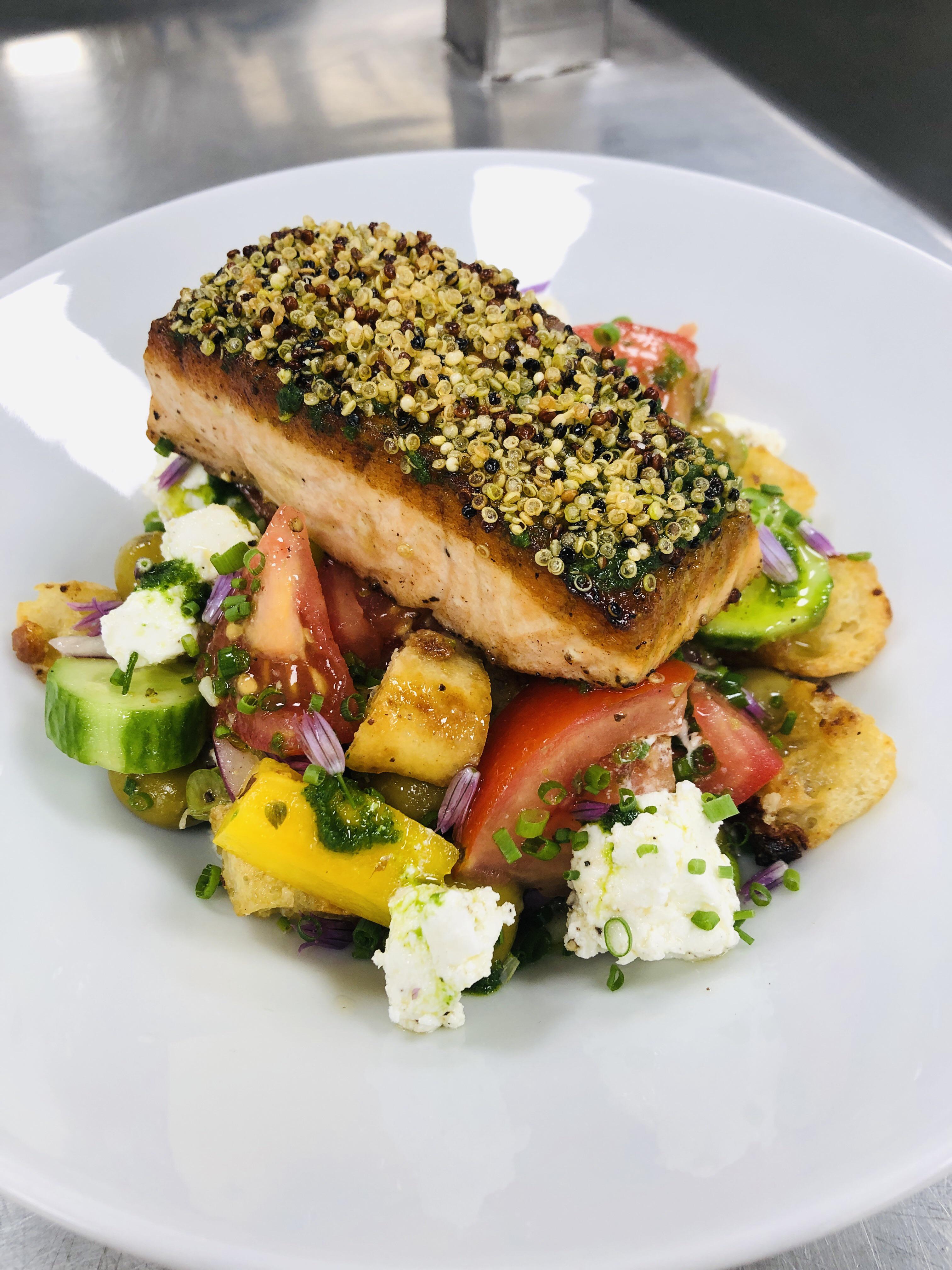 Crispy quinoa crusted salmon. Greek salad. Dill pesto. by Untetheredsoul-1 1 Comment 17Ram 2 years ago I think it looks amazing, and I would eat that! Good lighting too.Write A CommentYou must be logged in to post a comment.