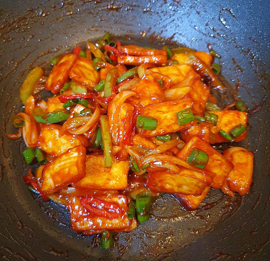 I made eomuk bokkeum before, but only with those thin sheets of fishcakes from the freezer. This time I found fishcakes by Dodo from the fridge section, nice and thick cakes. They taste wonderfull!! Might be using a bit less gochujang next time to make it a bit less saucy, lol.