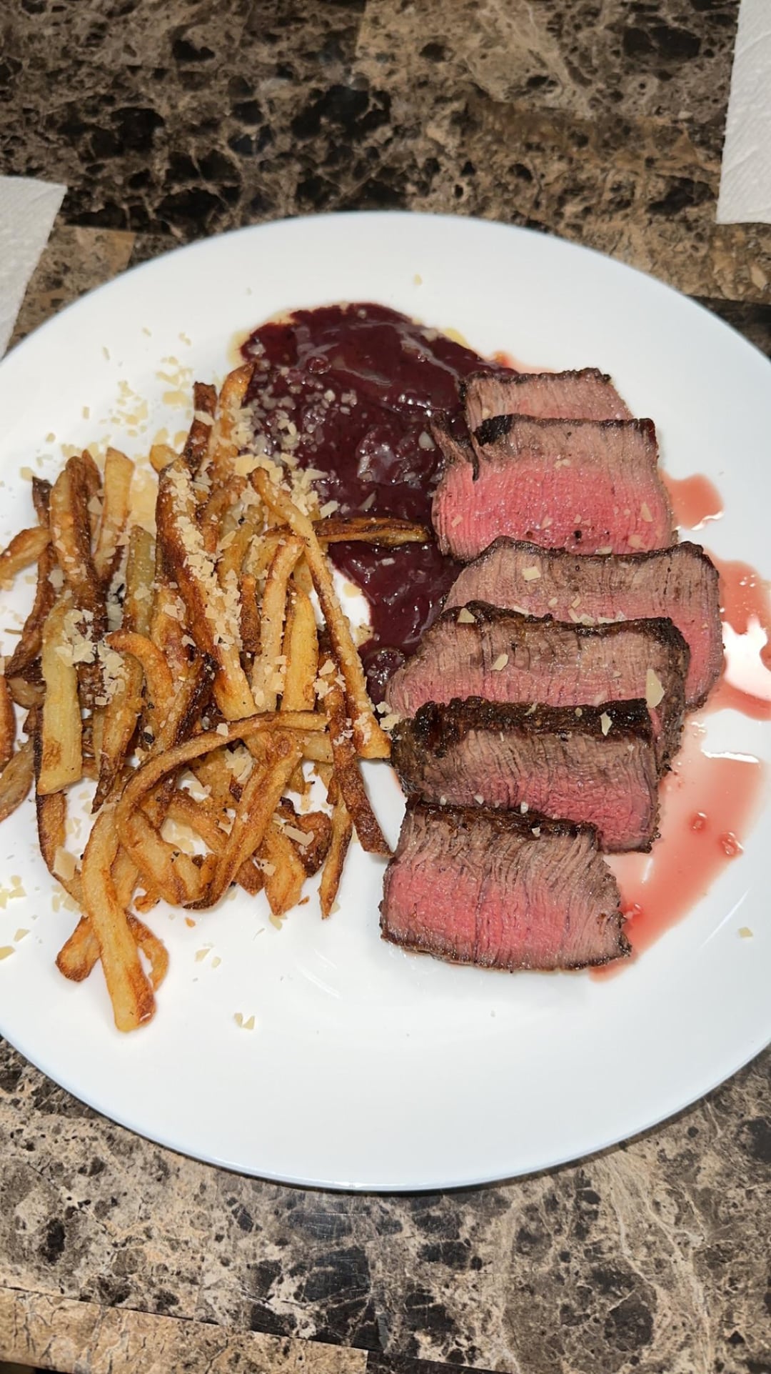 Cast iron seared filets finished in the oven. The fries were fried in olive oil and tossed in a garlic butter and topped with Parmesan and finished in the oven as well! Fries were a little overcooked but still pretty tasty.