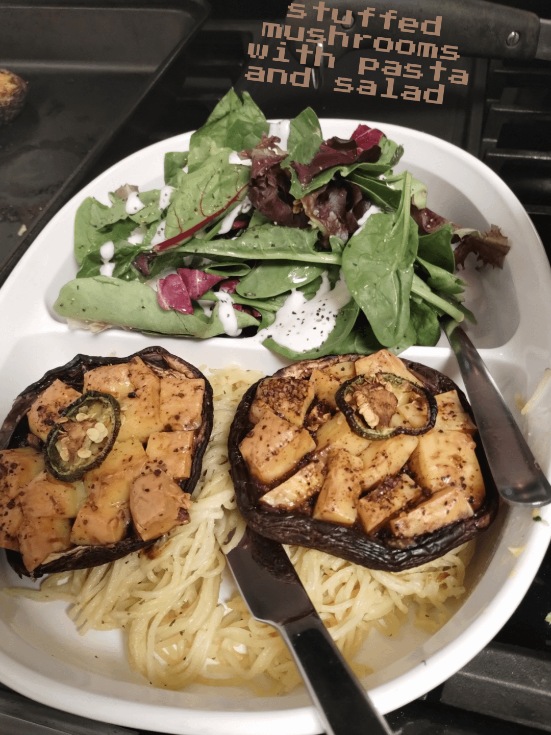 Portobello mushrooms stuffed with Gouda bacon cheese topped with jalapenos and seasoned with olive oil and grill mates hamburger seasoning.