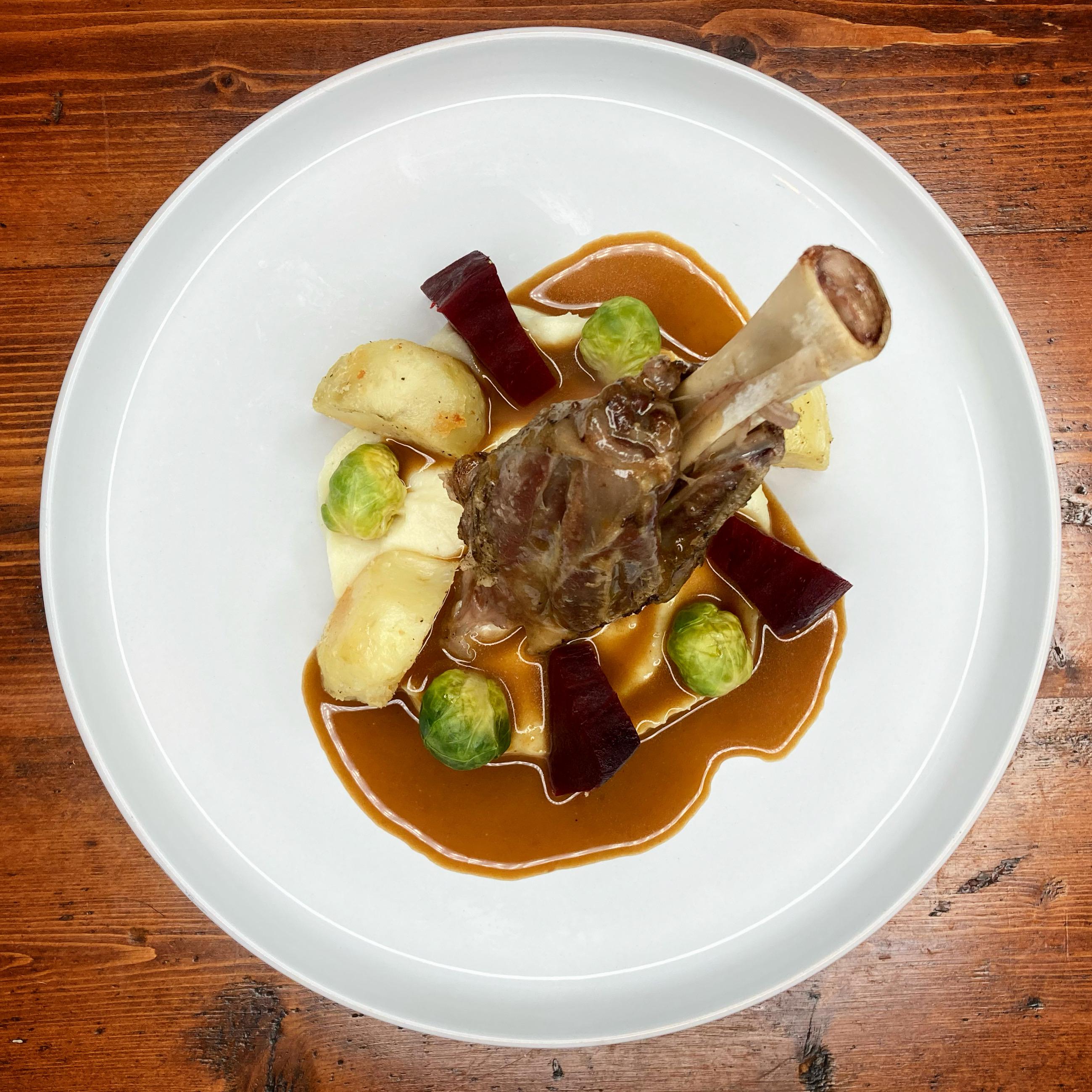 Lamb Shank || Hatcho Miso Butter Gravy || Beetroot || Baby Brussels Sprouts || Duck Fat Roasted Potatoes || Milky Parsnip Purée