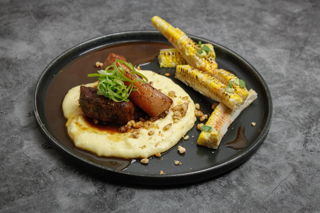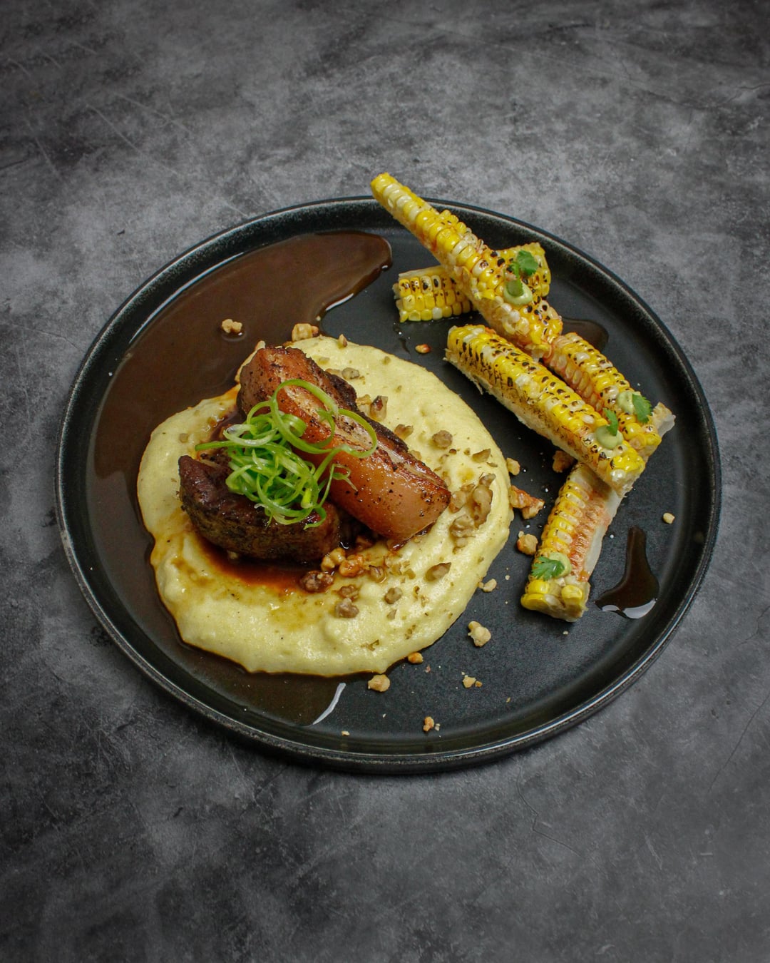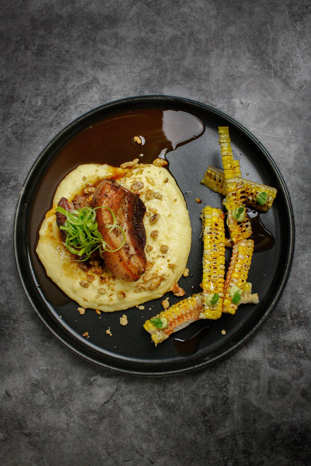 Pork belly on polenta w. Toasted walnut, scallion tops & brown ale & stock reduction / Butter poached sweet corn doused in chili infused olive oil, toped with a cilantro/feta cheese crema