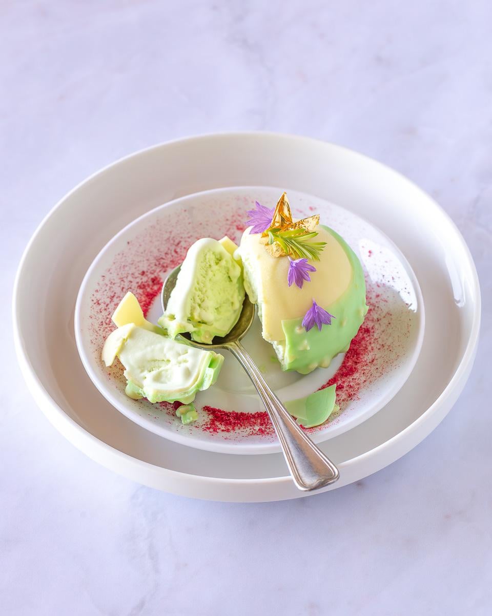 Redwood Tip Ice Cream with White Chocolate Pine Nut Shell and Dehydrated Raspberry Powder