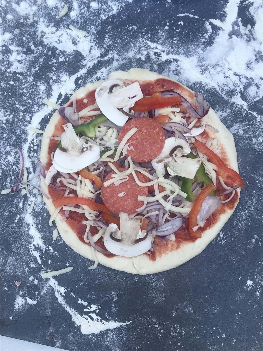 dough, tomato sauce, cheese, onion, bell pepper, two thin slices of salamiby hermandenblijkerr 1 Comment baekhyun7 3 years ago Homemade is the best, even calorie wise!! I’d say maybe 450 cal for the whole thing, it looks smallWrite A CommentYou must be logged in to post a comment.