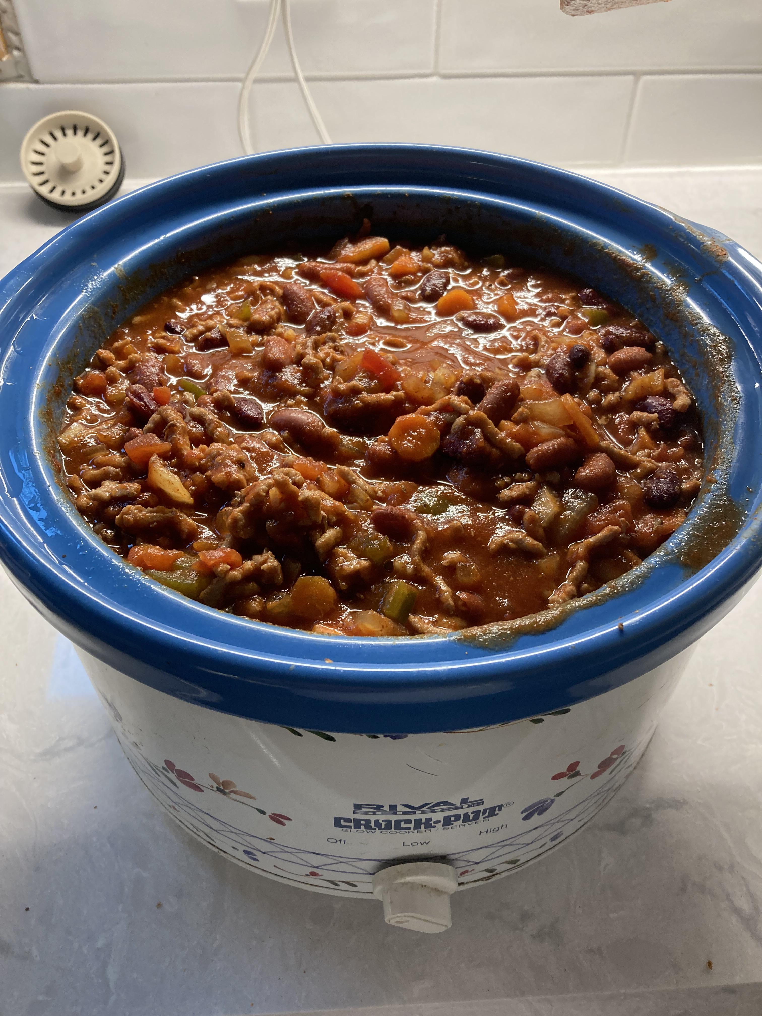 Turkey chili in a 5 qt (doe they make that size anymore???) Rivals crockpot
