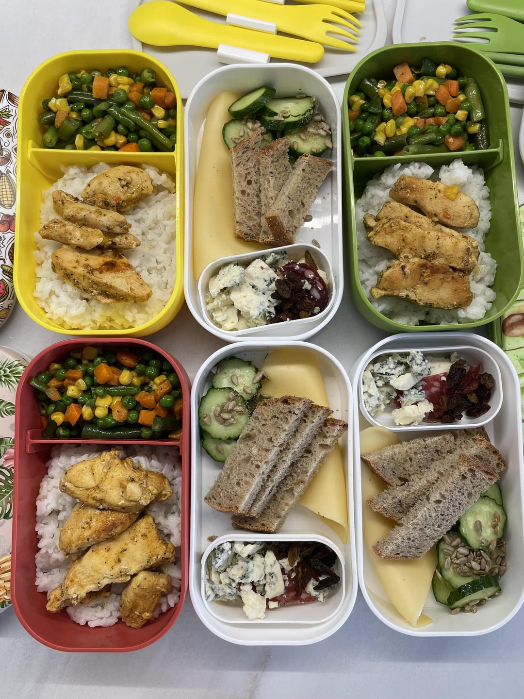 The second container includes Dorbleu cheese, Swiss cheese, raisins, salami, and three pieces of grain bread. I added cucumber seasoned with sunflower seeds to provide essential fats for energy.