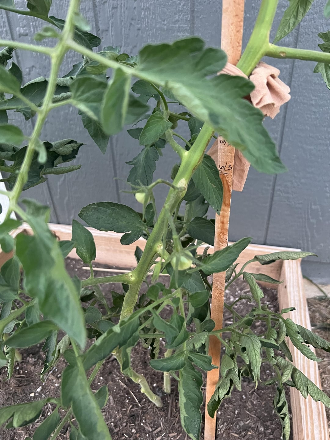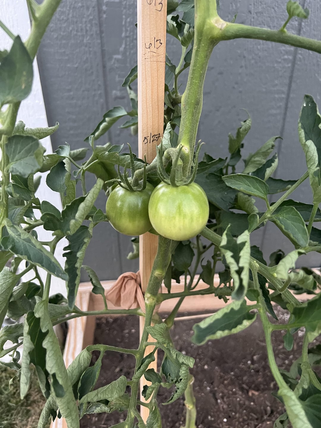 I am growing big boy tomatoes and I am super proud of myself but would love to know y’all’s opinion! No sign of end rot or anything, I see one of my larger fruits starting to show a seam at the top, is that normal or something I can/should correct? The one on the right is double stemmed, only one side produces fruit.