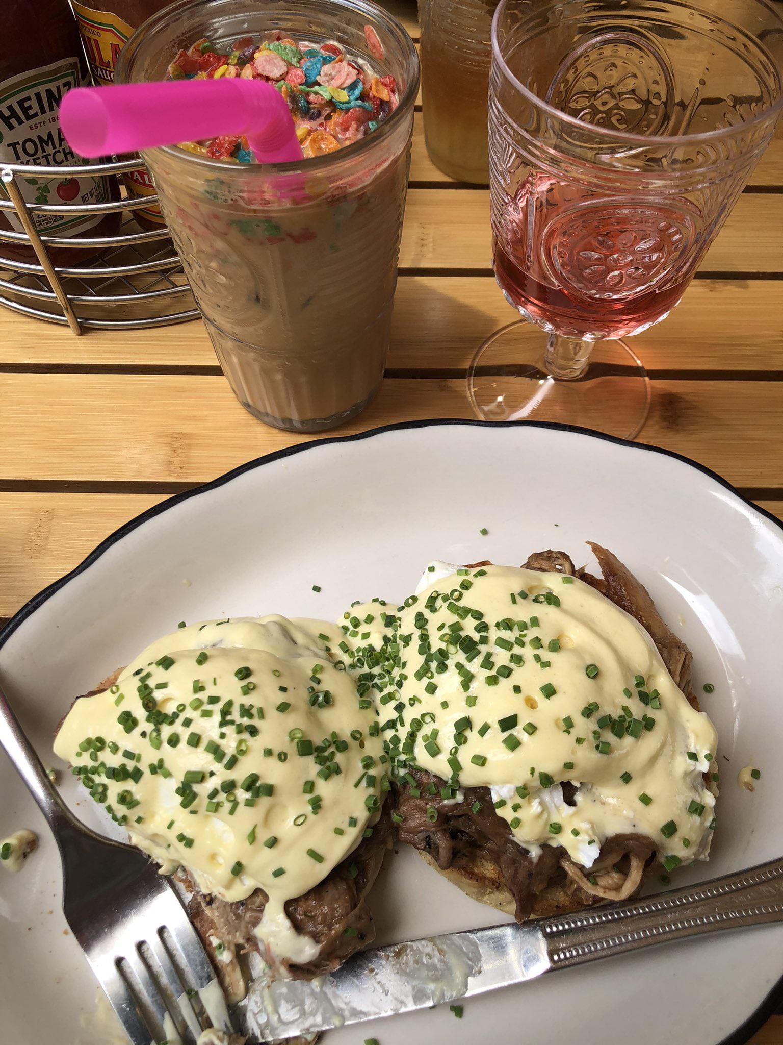 what are we seeing here? a benedict of some kind with a… milkshake of some kind?