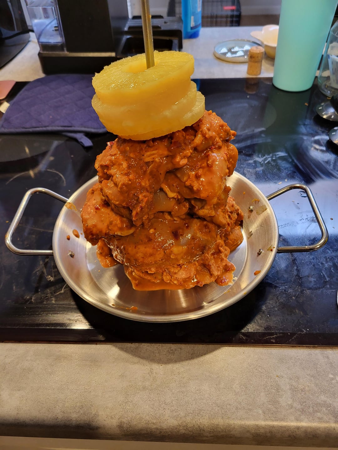 This may be the best chicken I’ve ever eaten. Marinated for 8 hours, smoked on the akorn for ~ 1hr45 at 375. First time using vertical skewer, definitely suggest probing a lot of spots with these. When the bottom read 165 the top was at 115.