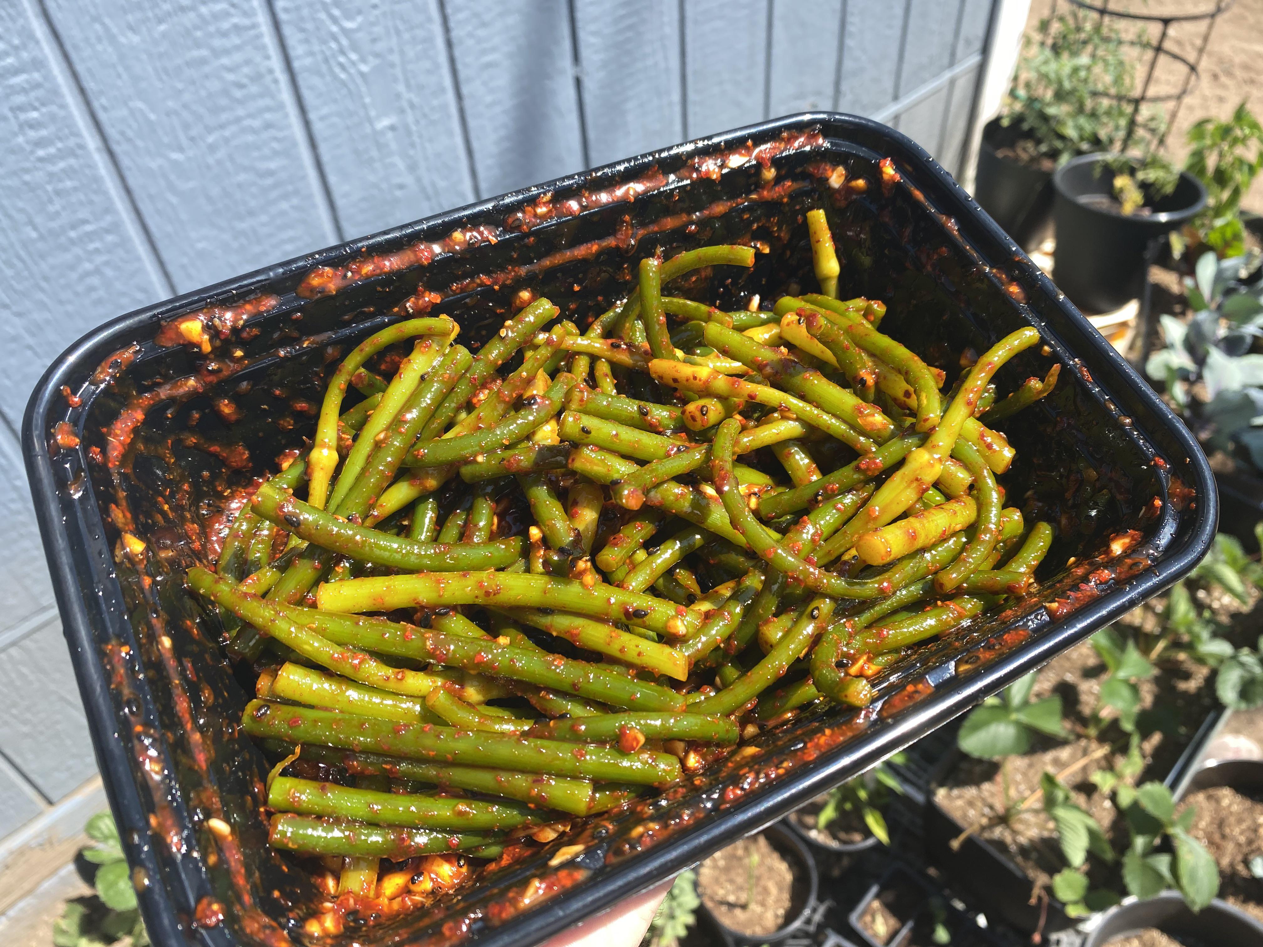 Blanch the scapes for about 1 minute, just to clean and slightly brighten. Add gochujang, gochugaru, plum extract, rice syrup or honey, sesame oil, sesame seeds! ENJOY!❤️❤️