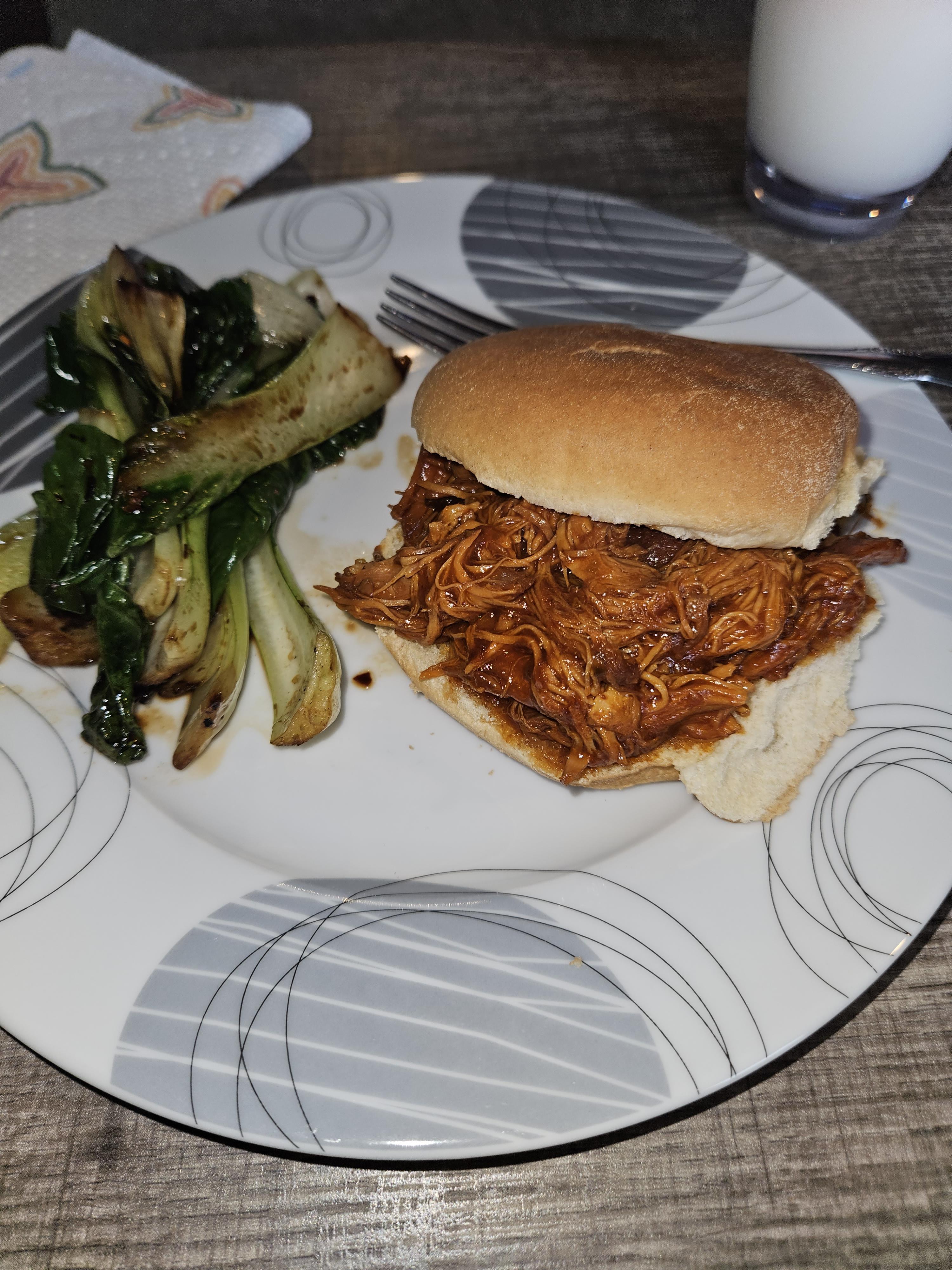 Pulled chicken made in crockpot with Datil pepper bbq sauce. Served with wilted Bok Choy. by Distinct-Yogurt2686 Write A CommentYou must be logged in to post a comment.