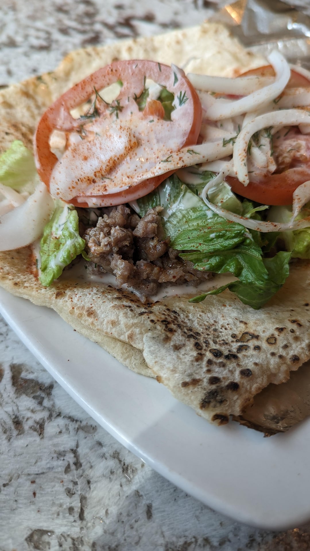Pita: 6 day aged Sourdough, baked for about 45 seconds per side at 780F, then brushed with a few drops of olive oil.