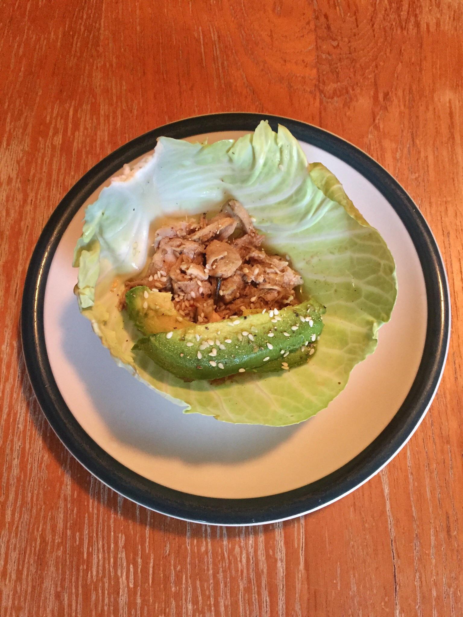 For this dish, I thawed my cooked chicken overnight in the fridge, whipped up a mix of soy sauce, honey, sriracha, and a splash of cider vinegar (all to taste), tossed it with the chicken, then reheated it in loosely wrapped foil in my toaster oven. A cabbage leaf, some avocado, and a sprinkle of sesame seeds and a touch of pepper and … voila!