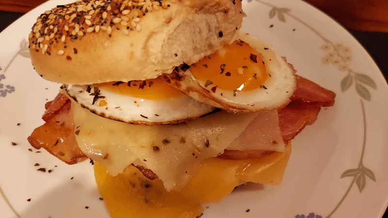 B.E.C. on a bagel. Bacon, a couple of eggs, Gouda and pepper jack cheeses with some creamy horseradish on a toasted everything bagelby toneman238 1 Comment certifiedsillyghorl 3 years ago This looks amazing! I might attempt to recreate this soon! Thanks for the idea 🙂Write A CommentYou must be logged in to post a comment.