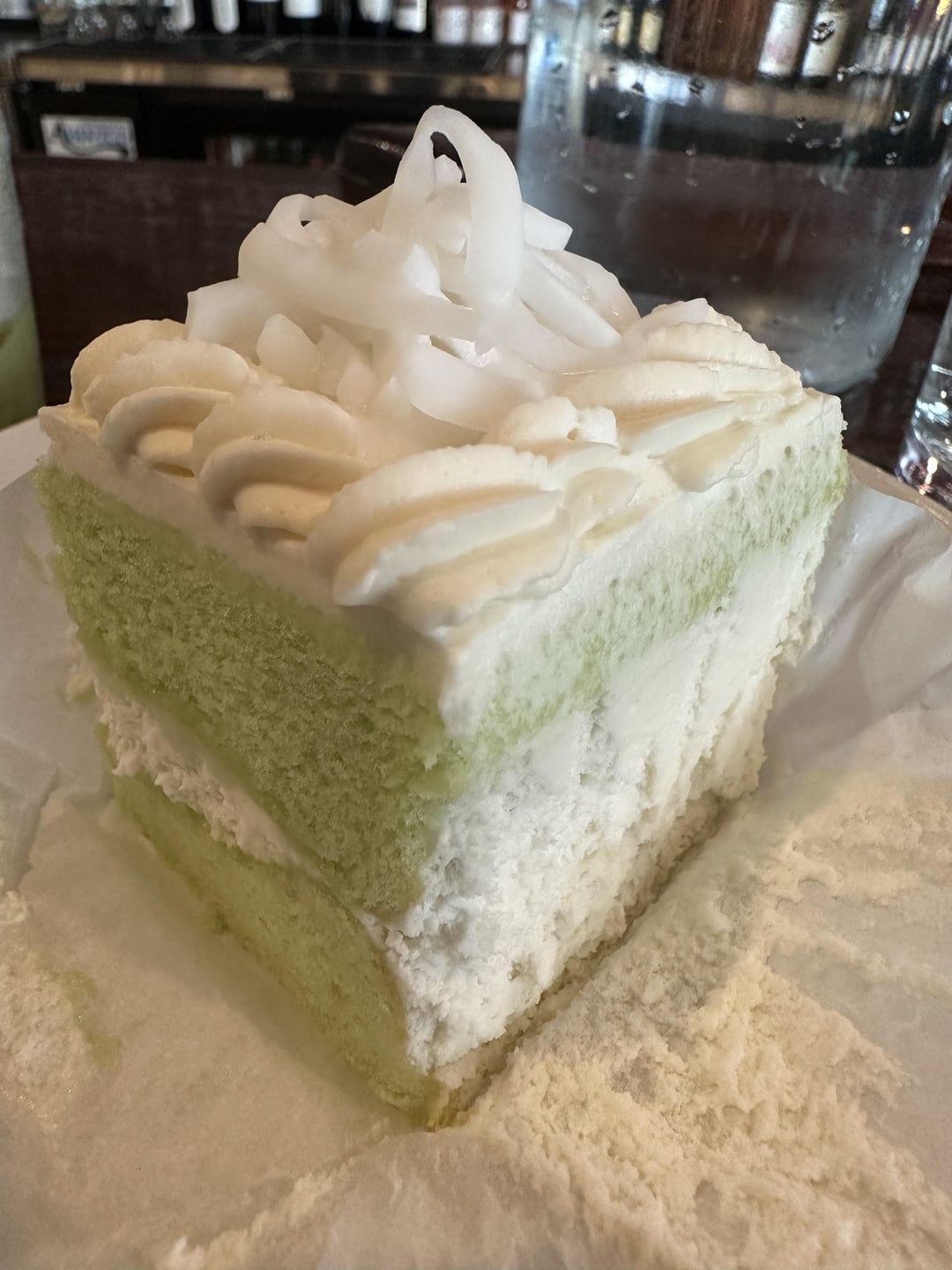 The bar gifted me a slice of Coconut Cake. Itโs delicious, light and sweet.