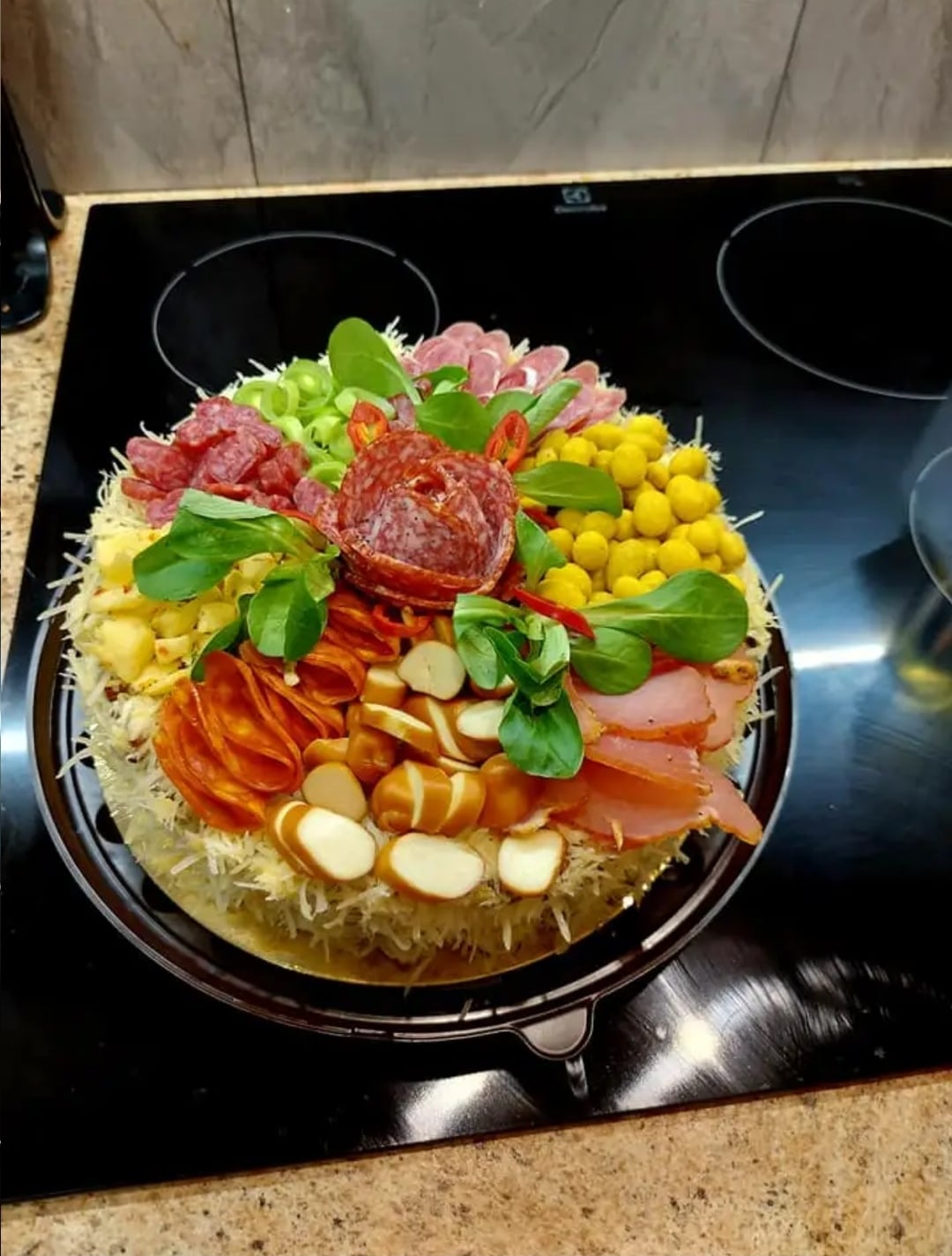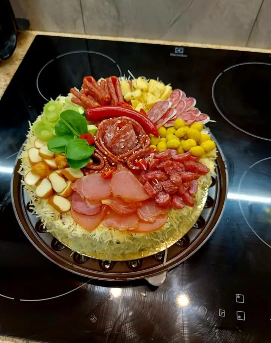 Is this a cake made of bread with sandwich toppings? Why no cross section? Wait is there mayo/mustard inside between layers? What’s the “frosting?” What are those green sliced things and the little yellow ball things on top?