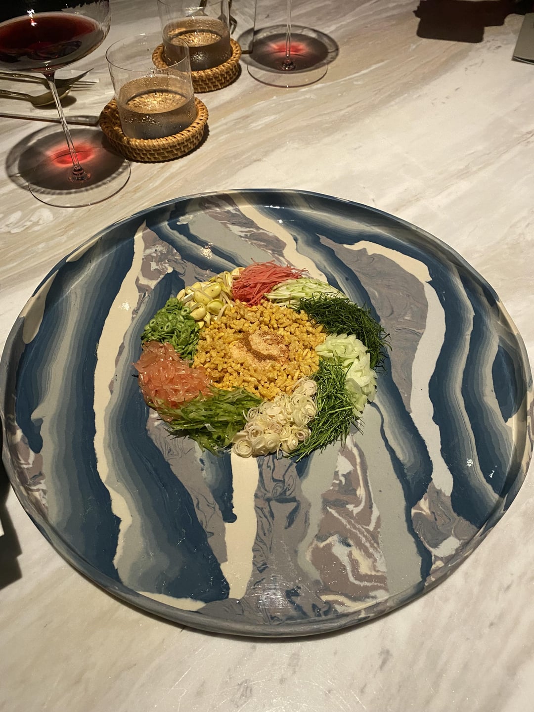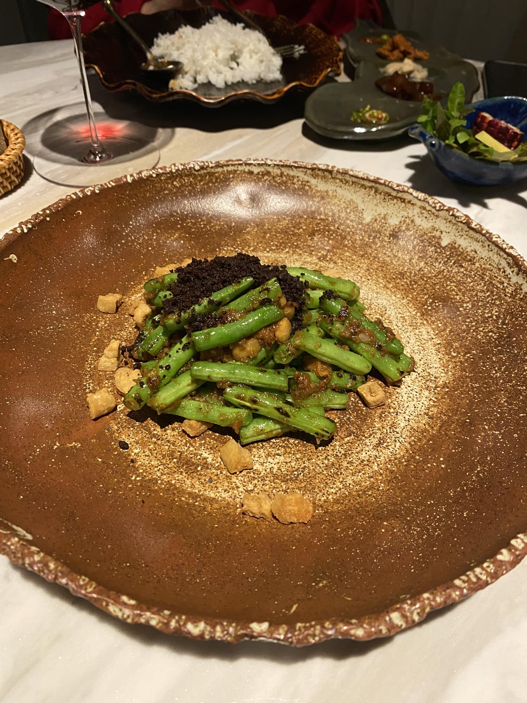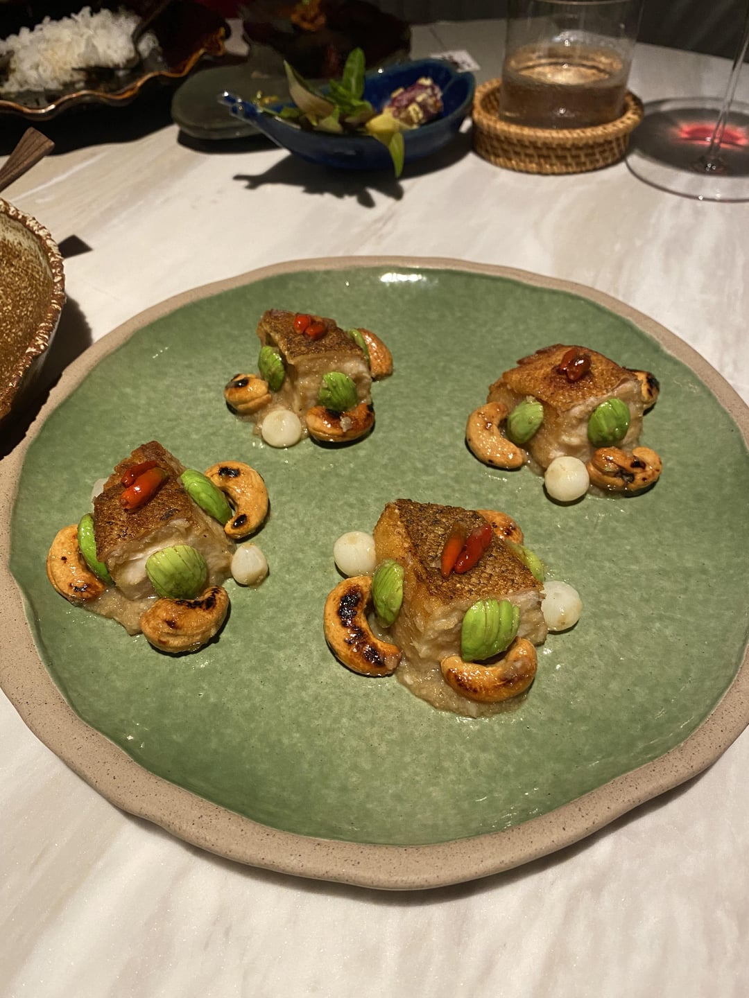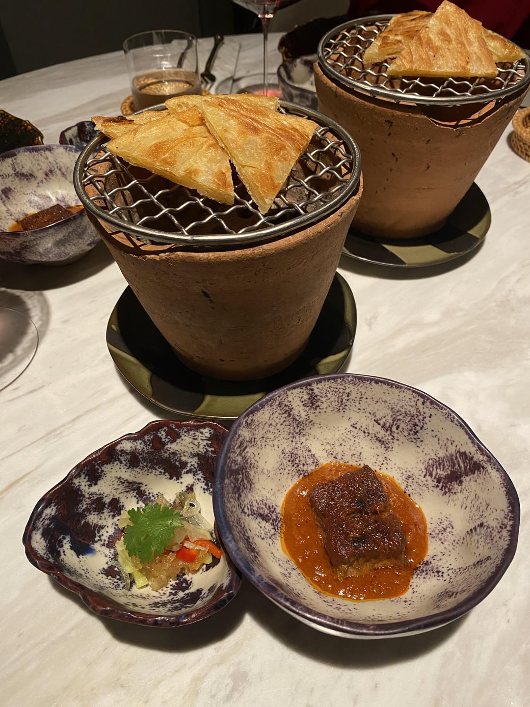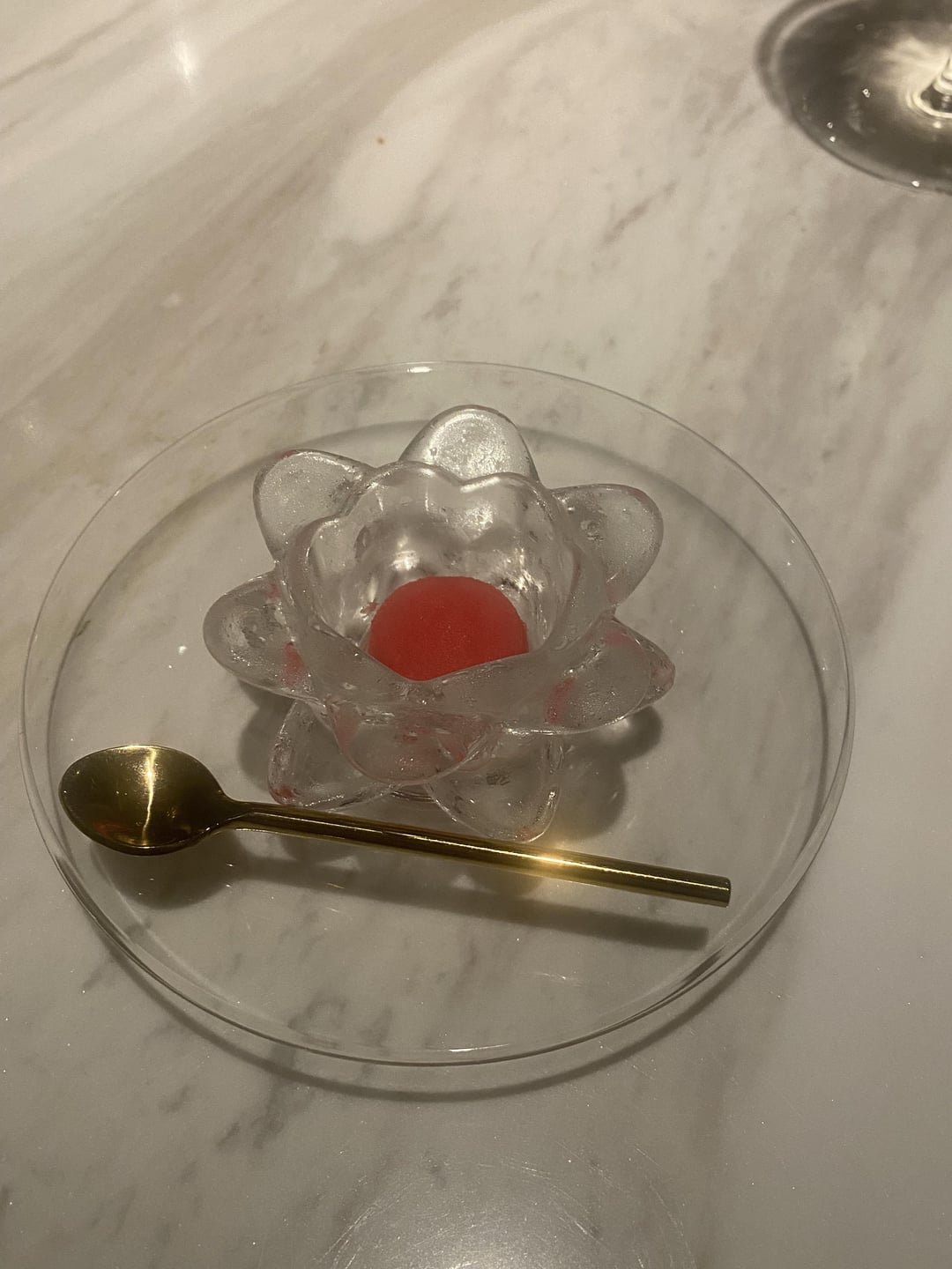 1. Amuse bouche: a series of in-seasoned bites. 2. The beach: Sand mole crab/seaweed powder. This was delightful. Crunchy, salty. 3. Phuket lobster, cuttle fish, trevally: The raw lobster was well-prepared with a slight kick in chili pepper. Trevally fish looks mild but was the spiciest of all. 4. Jorang: we were presented with the ingredients, while our waiter explained the origin and significance of each ingredients. This was a common theme throughout the meal and allowed us to really appreciate Southern Thai cuisine. 5. Torch ginger flower: I’ve never had torch ginger flower sorbet before. It was sour and a refreshing course. 6. Gems on crab stick: A signature at Sorn. The crab and its roe were sweet and fresh. Yellow chili paste provided a nice punch of spice. Perfect. 7. Coconut: Our waiter encouraged us to take a sip of the coconut soup right away to cool down our palate. This was salty with a hint of dried seafood. 8. The sea holds the forest: Another signature at Sorn. 10 kinds of Southern herbs were beatifully presented and finished tableside with the tamarind sauce. 9. Roti – Southern beef curry. Perfect. Really just amazing. Masaman style beef curry was so fully of flavor, paired perfectly with the buttery roti. 10. Main courses: we were then served a parade of dishes with rice. Everything accompanied with side dished of chili paste, chicken skin, dips. Our waiter ensured we never run out of rice. My favorites were the crab curry and the stinky bean with grouper. 11. Jungle curry: this was not included in the menu, but the kitchen wanted us to try. We were told this would be very spicy. They were not wrong. Extremely flavorful. 12. Mushroom clear soup: last savory course to clean our palate. 13. Sago boiled in young coconut water, longan ice-cream: a great first dessert. Not too sweet but a cooling break in the meal. 14. Seasonal canned fruit: this month, it was watermelon. The fruit was prepared 3 ways: granita, compressed, jelly. 15. Coffee/Tea service with Thai pan cake: We were asked whether we preferred Thai tea or coffee with condensed milk. This was served with buttery cupcake type dessert. I was so full at this point couldn’t help eating 2 of the cake. 16. Petit four: We thought we were done, but the service team wheeled out a cart full of little bites. Our waiter asked which one we prefer but encouraged us to take everything. As full as we were, we complied. Little bites of Thai dessert. It was delightful.
