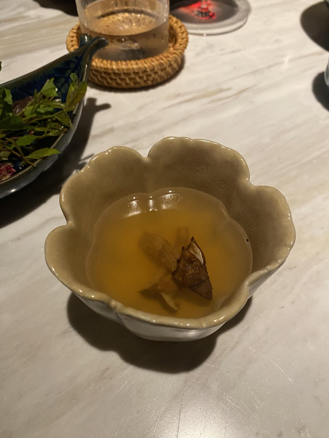 7. Coconut: Our waiter encouraged us to take a sip of the coconut soup right away to cool down our palate. This was salty with a hint of dried seafood.