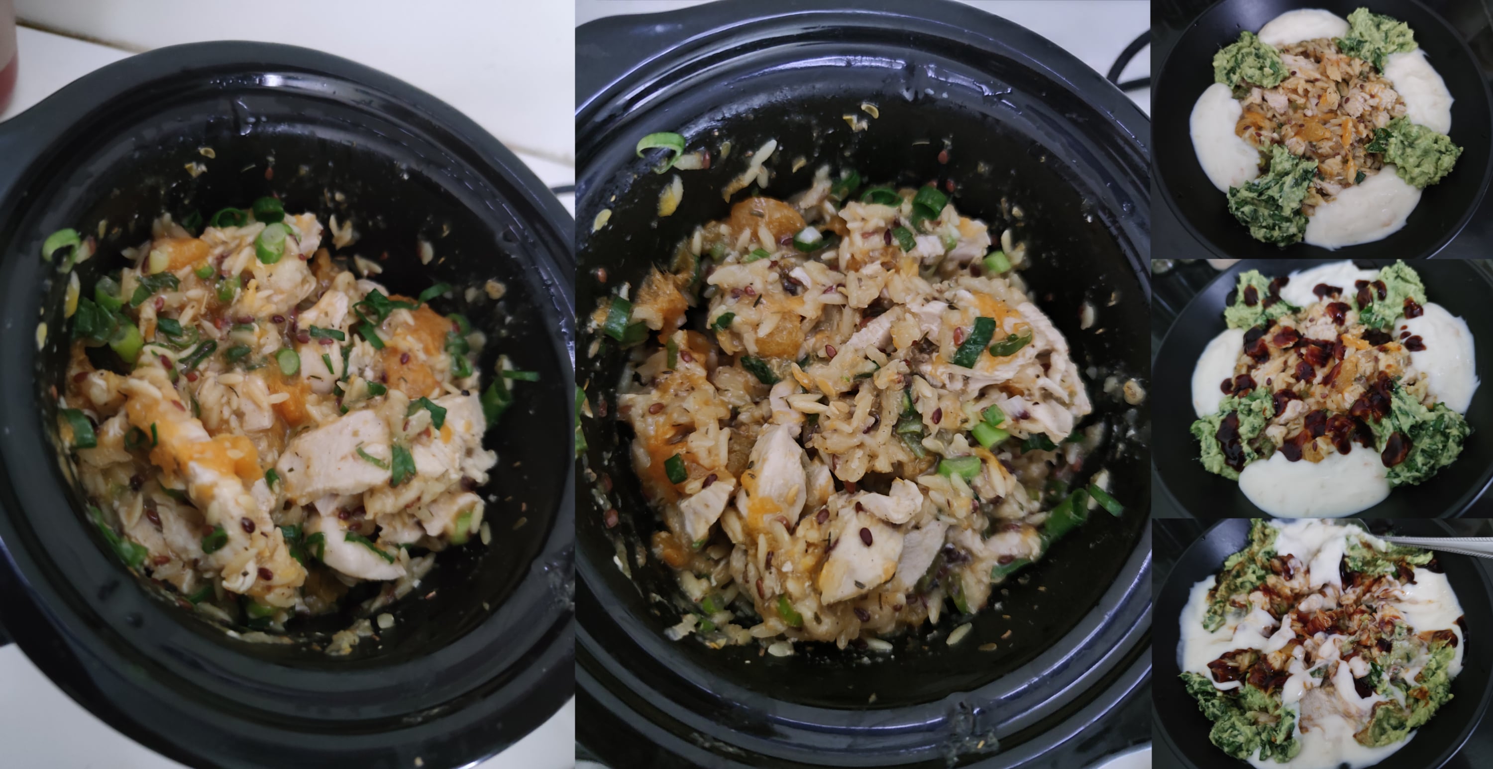 Removed chicken and drained slow cooker. Adding can of diced Apricots with juice. Also ½ cup orzo and 5 tbs flaxseed stirred through.